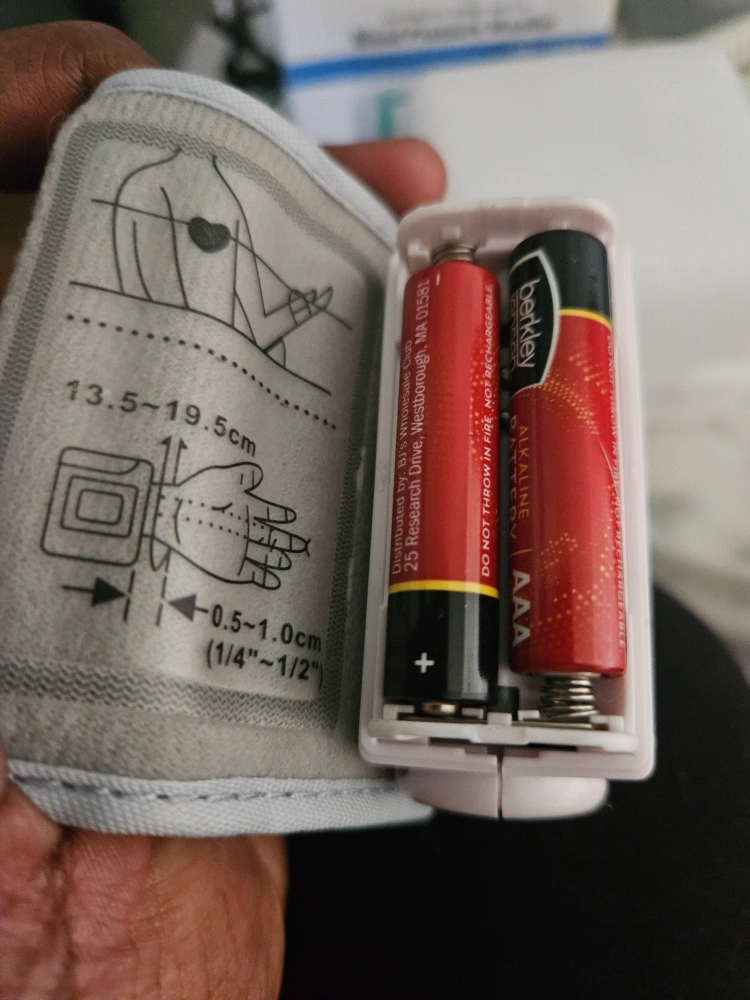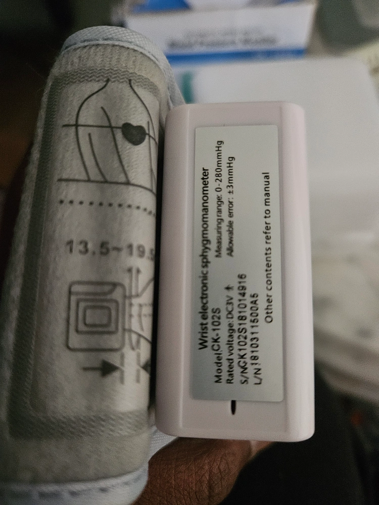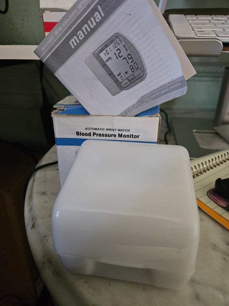 Compact wrist blood pressure monitor. Includes a digital screen and buttons for operation. The monitor features a white cuff and is ready for use when you need to track your vitals. Checking your blood pressure can give you peace of mind. Batteries not included. 2x AAA