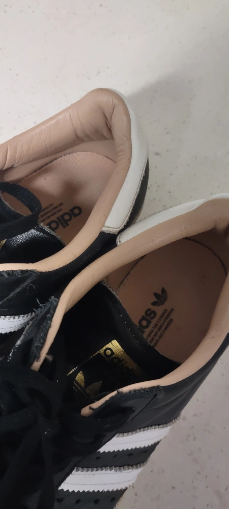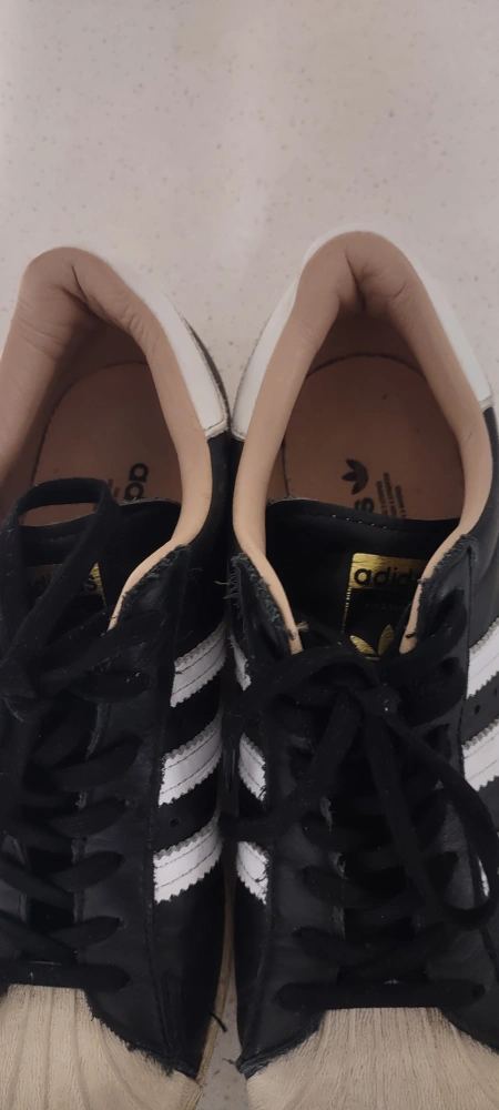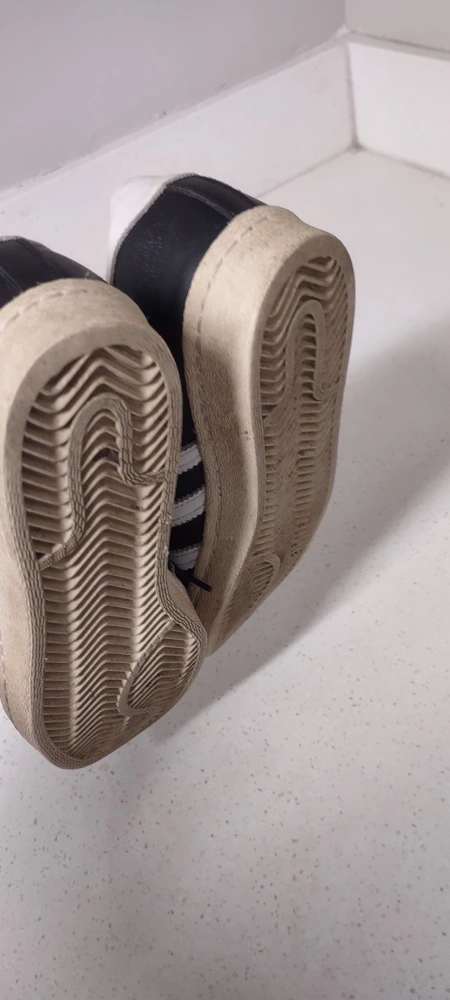 Black sneakers with white stripes. Cream-coloured toe caps. Black laces. Logo on the tongue and insole. A great pair of shoes to wear for a relaxing stroll.
