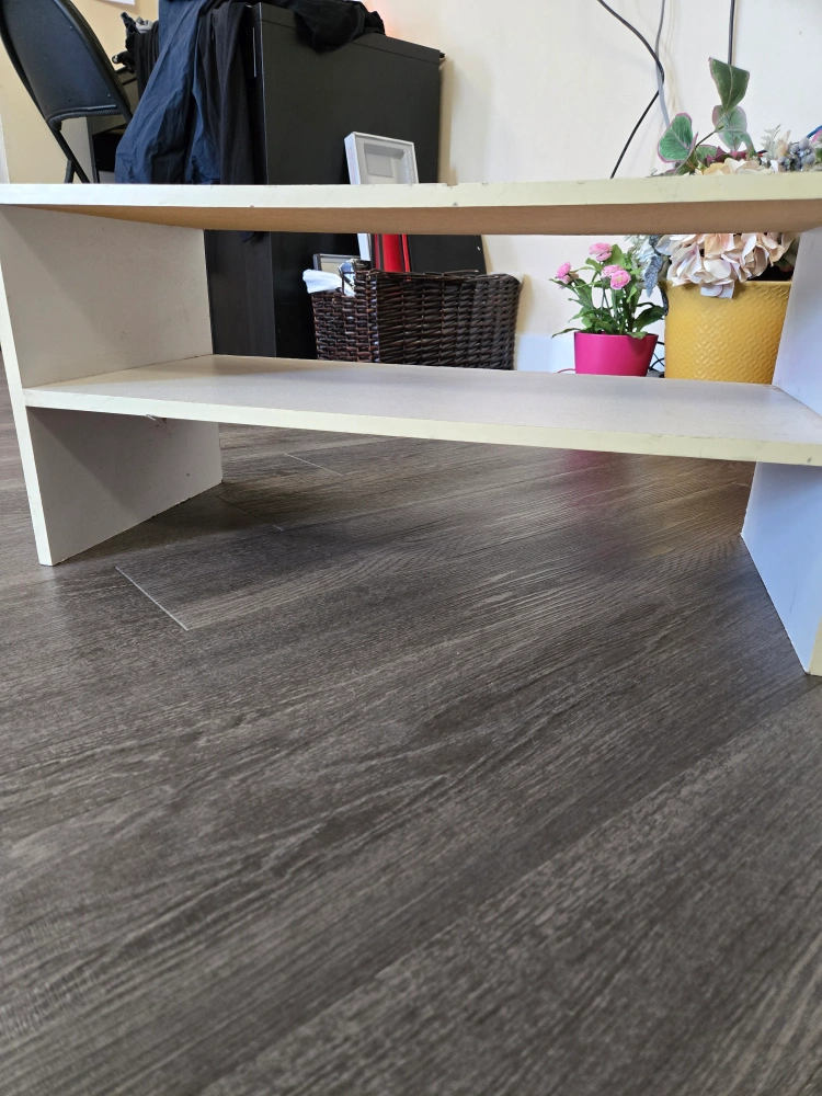 A white shelving unit with two shelves. It sits low to the ground. It can be used to display your favourite belongings, creating a sense of serenity.