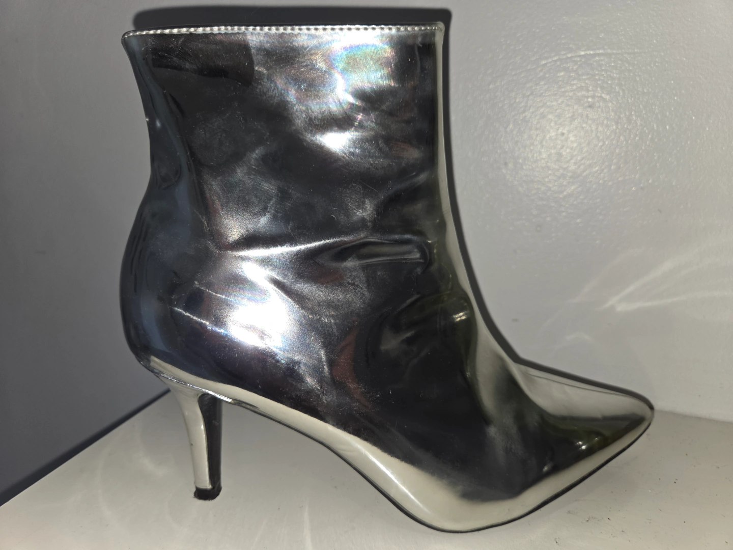 Silver metallic ankle boots. Pointed toe style. Heeled boots. Great boots for special occasions, or simply adding a touch of fun to any outfit, making your day a little brighter.
