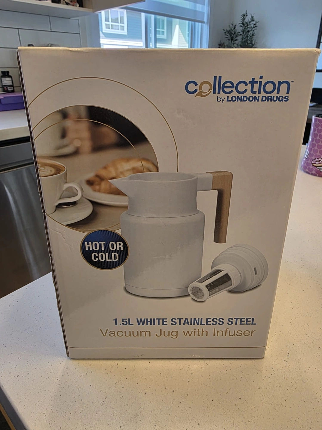 64White stainless steel vacuum jug. Comes with an infuser. The handle features a wooden accent. A great choice for a soothing cup of tea.