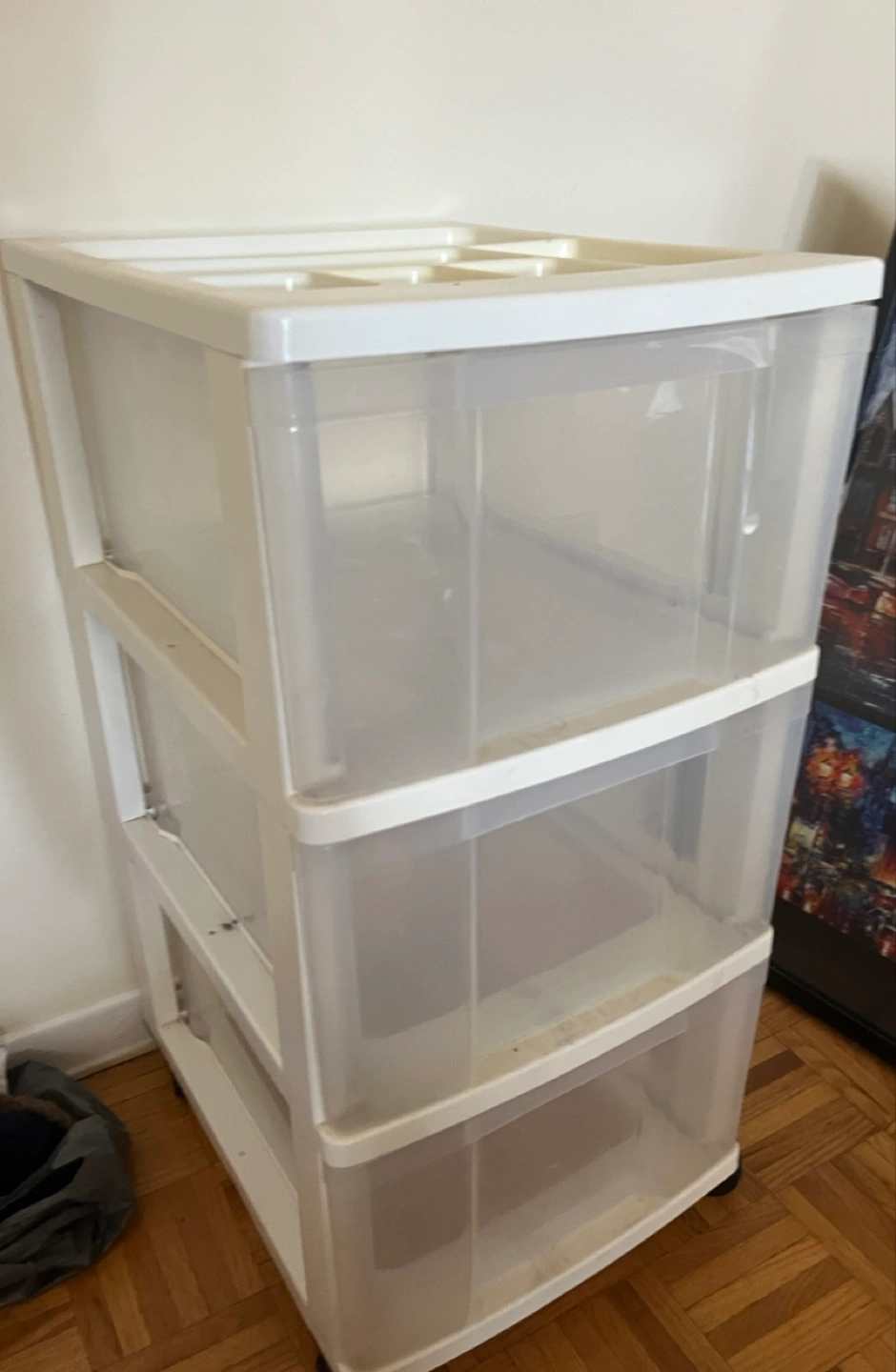 White plastic storage unit. Three drawers, clear plastic. Top of unit has various compartments. Great to organize your life,