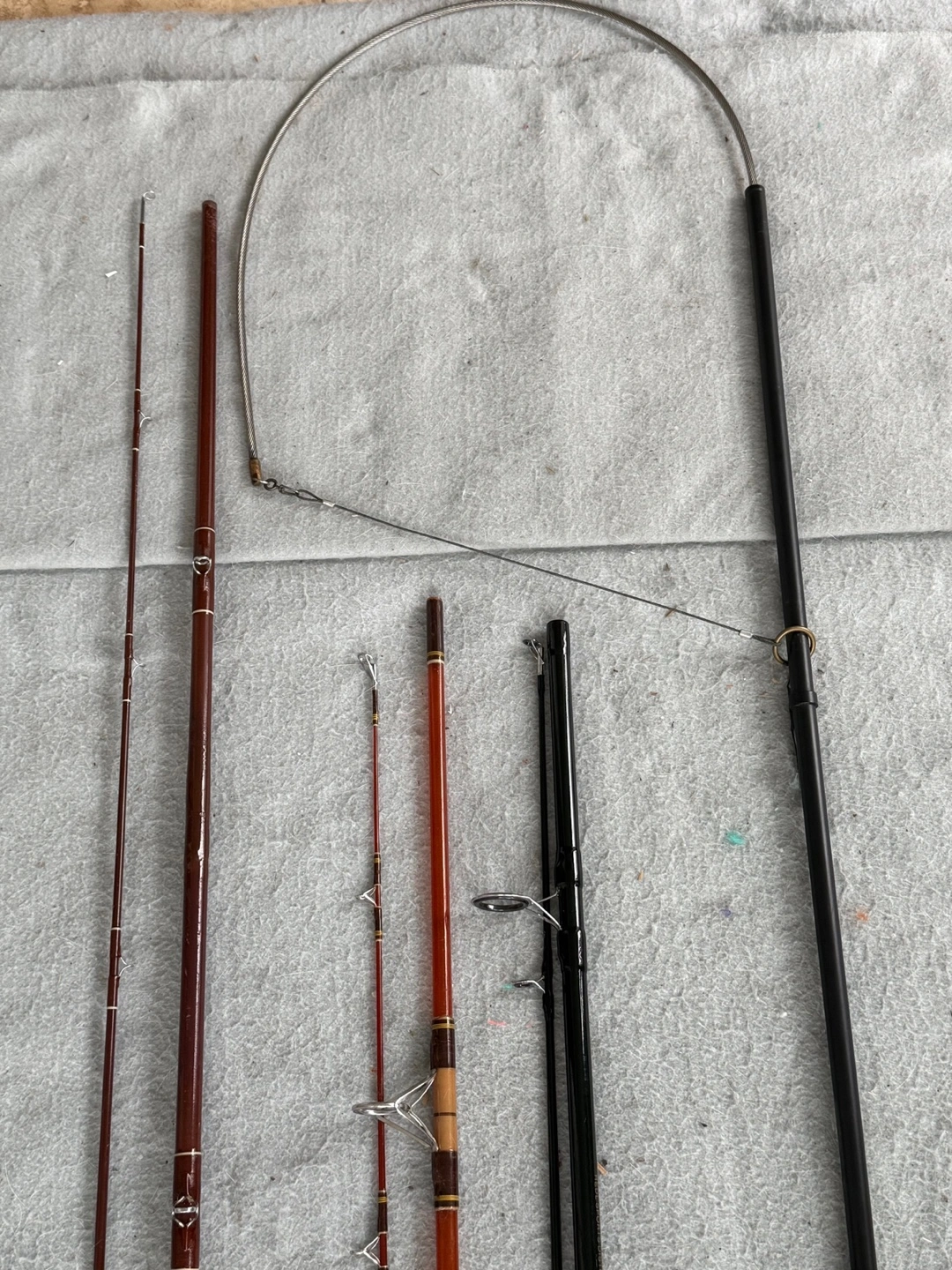 Several vintage fishing rods are shown. Cork handles are present, as well as dark brown and black rods. They may be perfect for a relaxing day by the water.
