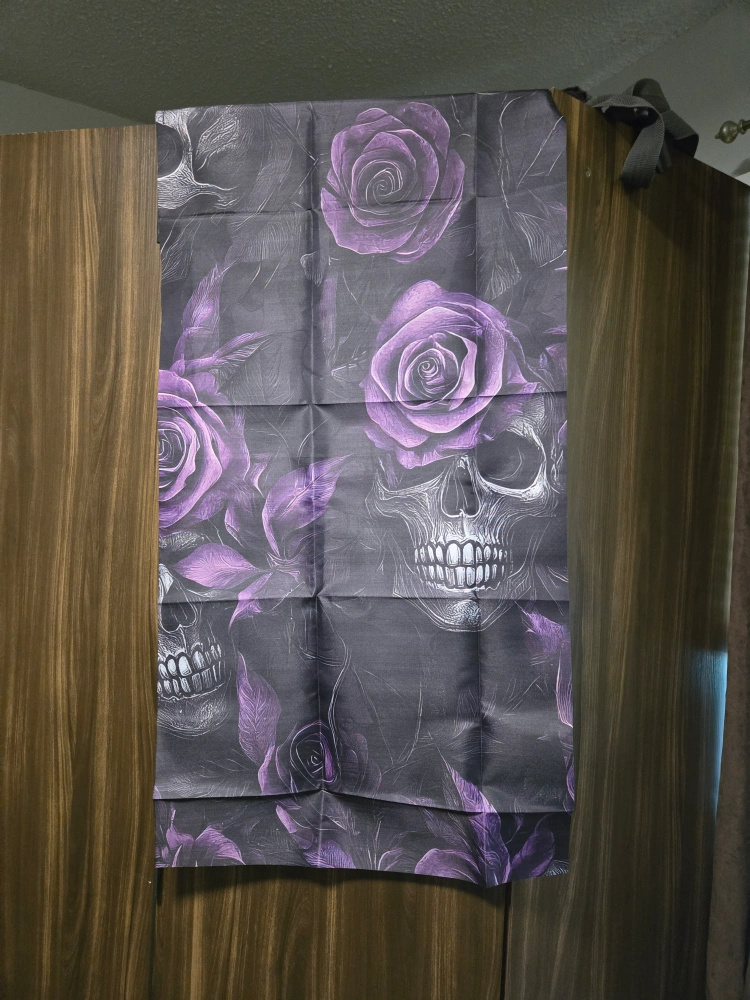 Fabric wall hanging. Features roses and skulls. Dark grey background. The calm aesthetic will make any space feel more relaxed. 2 sets