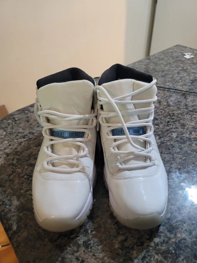 White sneakers with black lining and blue accents. Men's size 11. Only worn once. Replacement box available. P/U only.
