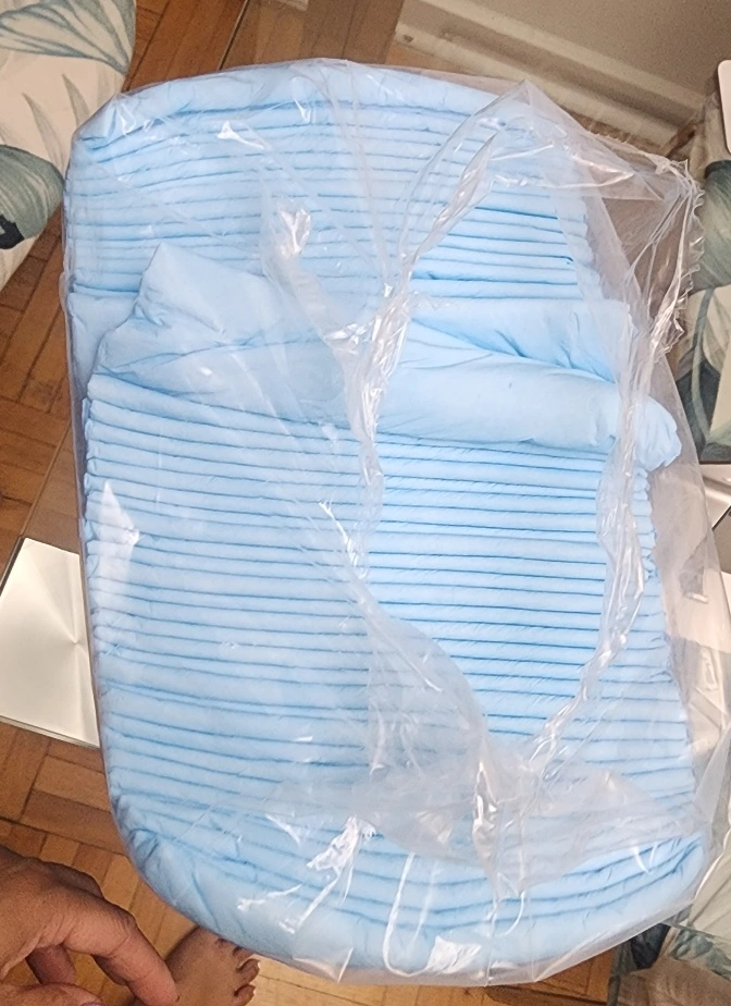 50 large pack of bed pads. They are blue with horizontal lines. Wrapped in a plastic bag. These pads can help provide some peace of mind during a night's sleep.