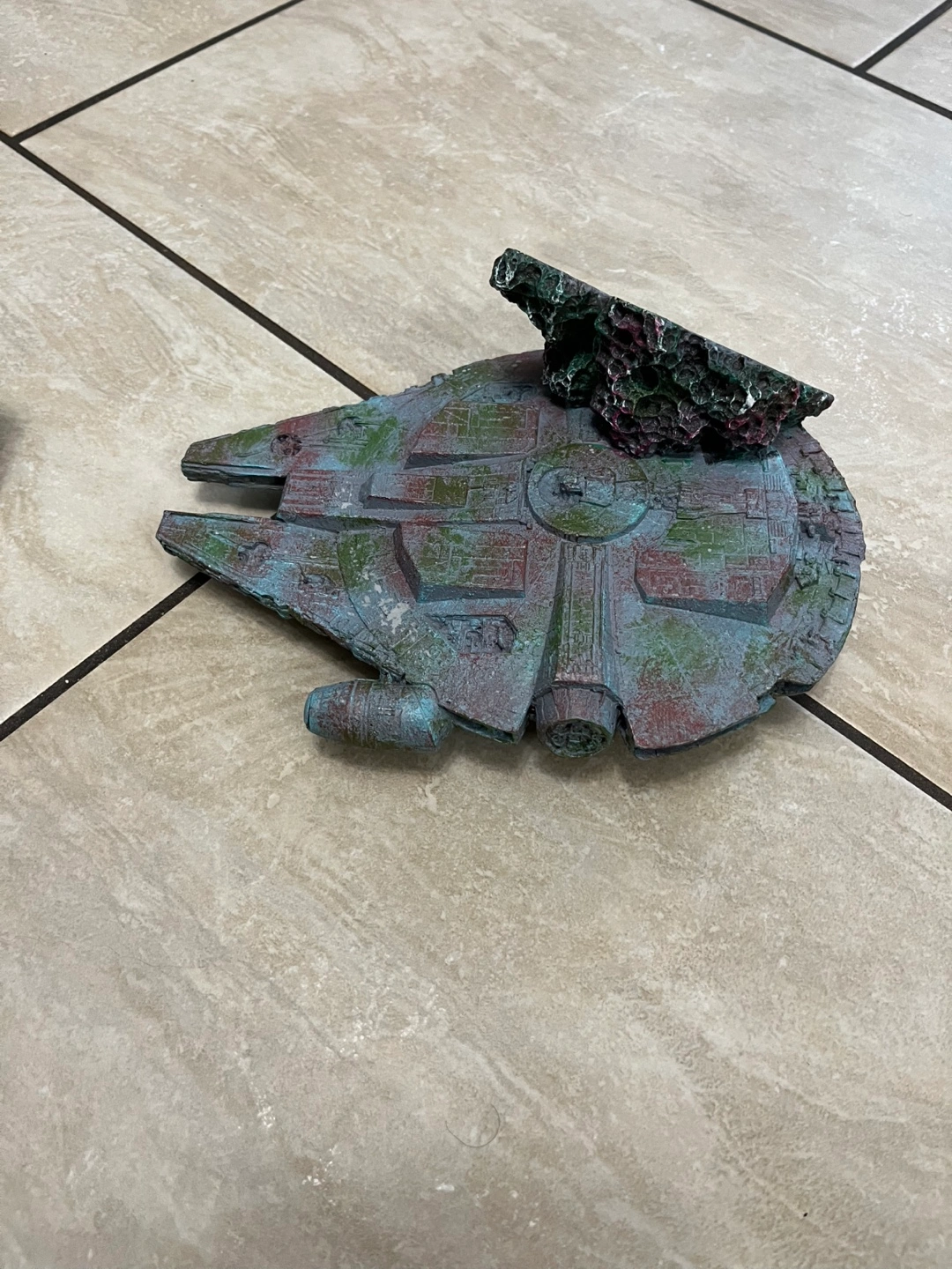 The spaceship aquarium decorations bring a bit of character to any tank. The spaceship looks like a weathered wreck space vessel. The colours are a mix of greens, blues and browns, giving an aged effect. The top piece has a straised rock-like formation. Add this to your aquarium for a pleasant touch of interest.