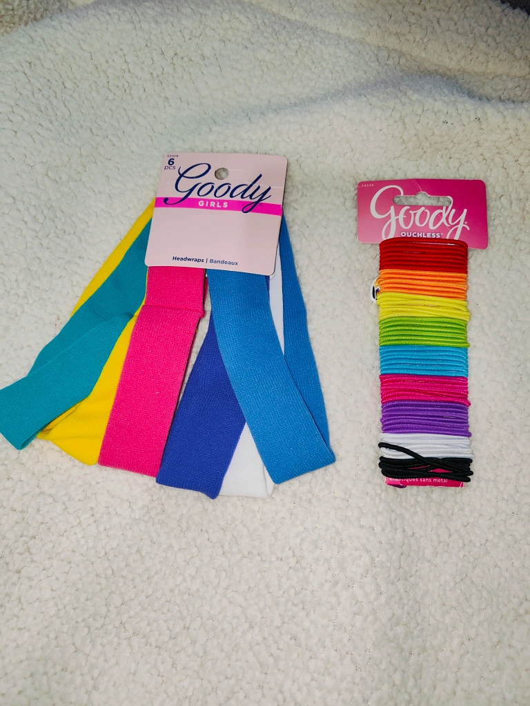 57A pair of accessories to keep your hair in place. Multiple coloured headbands. Several coloured hair ties too! ☺️
