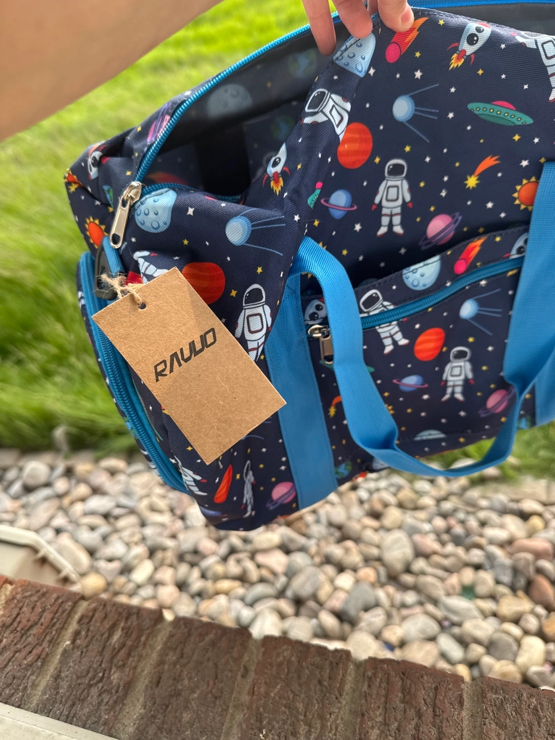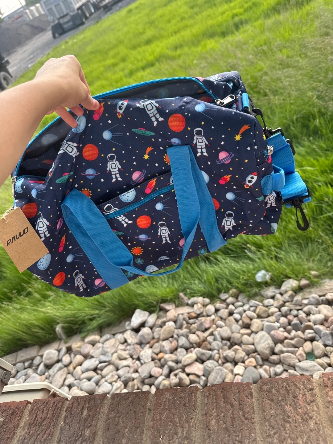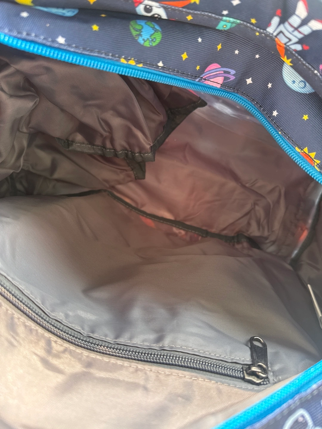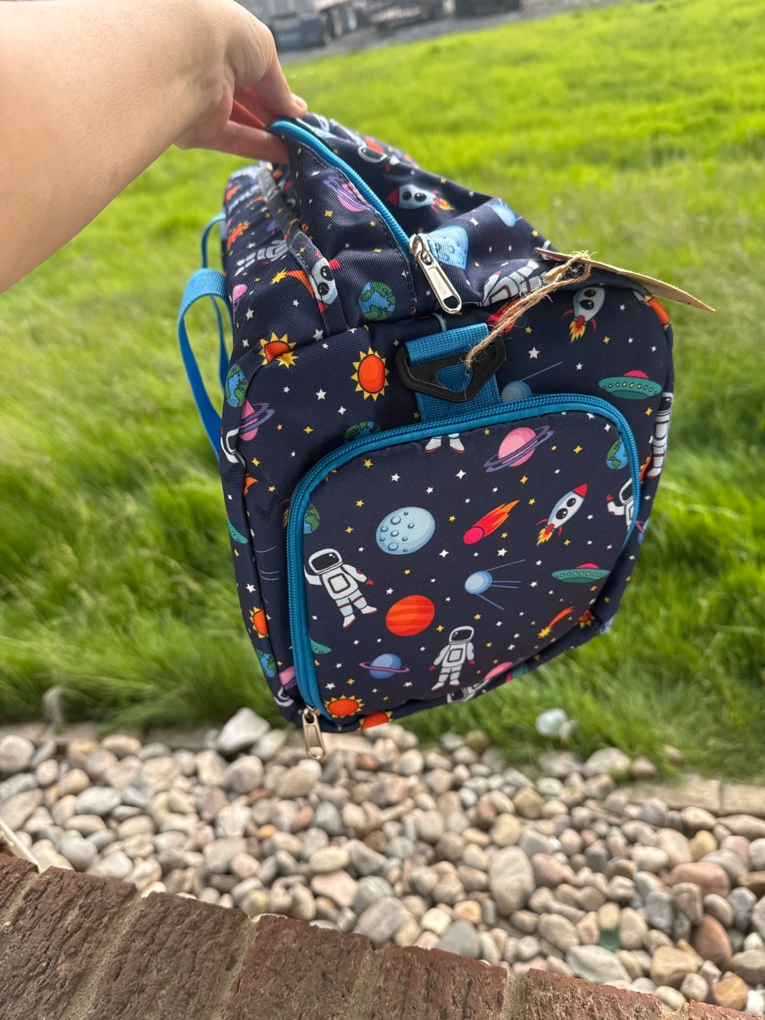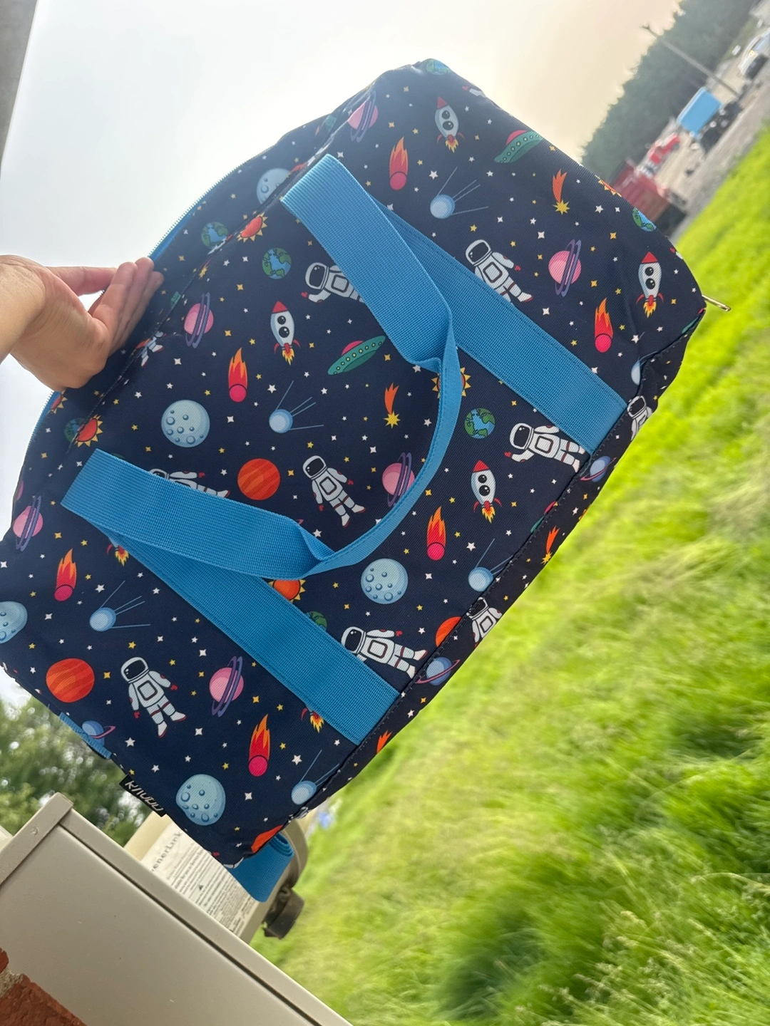 A wonderful bag, covered in a fun space theme print. Comes with a blue carry strap and handles. There's a large main compartment with an internal zippered pocket and a front zippered pocket. Consider using this bag to store your books, and travel comfortably knowing everything is in one place.