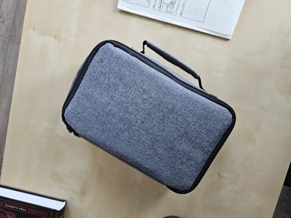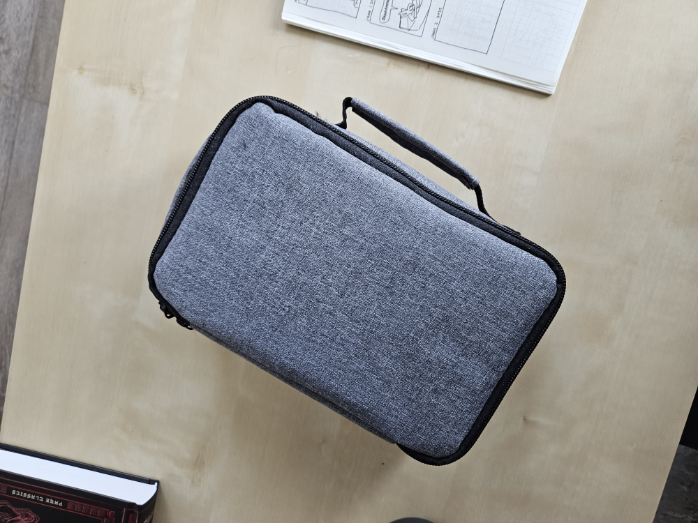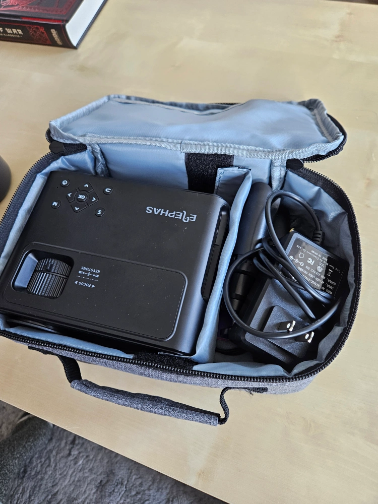 The mini projector comes with a carrying case. Included are a power cable and adapter. Perfect for a relaxing movie night. It is black with control buttons on top.