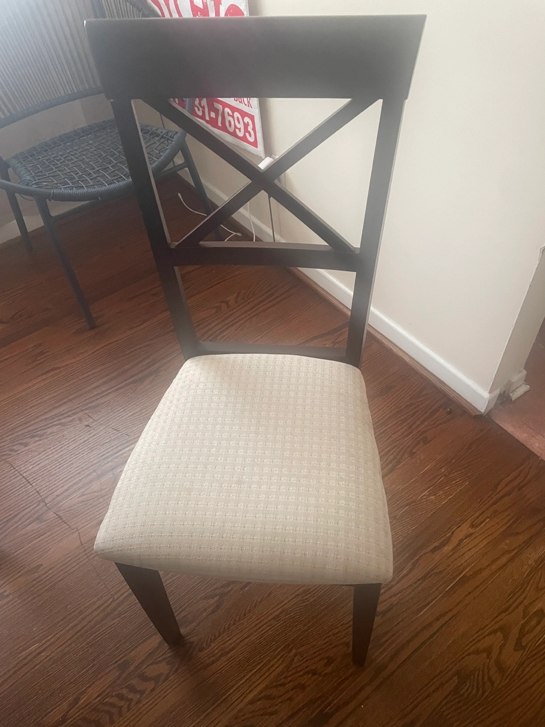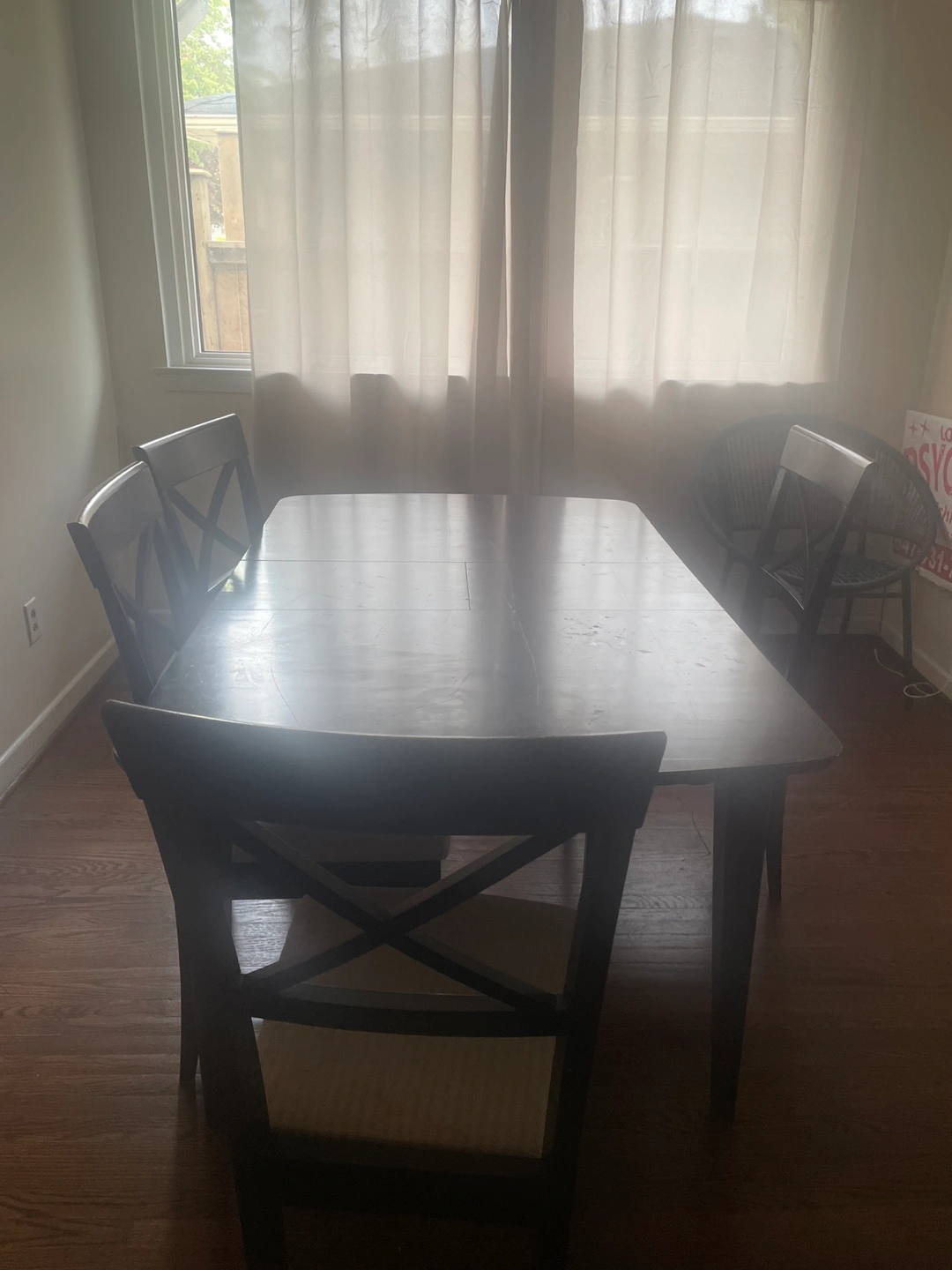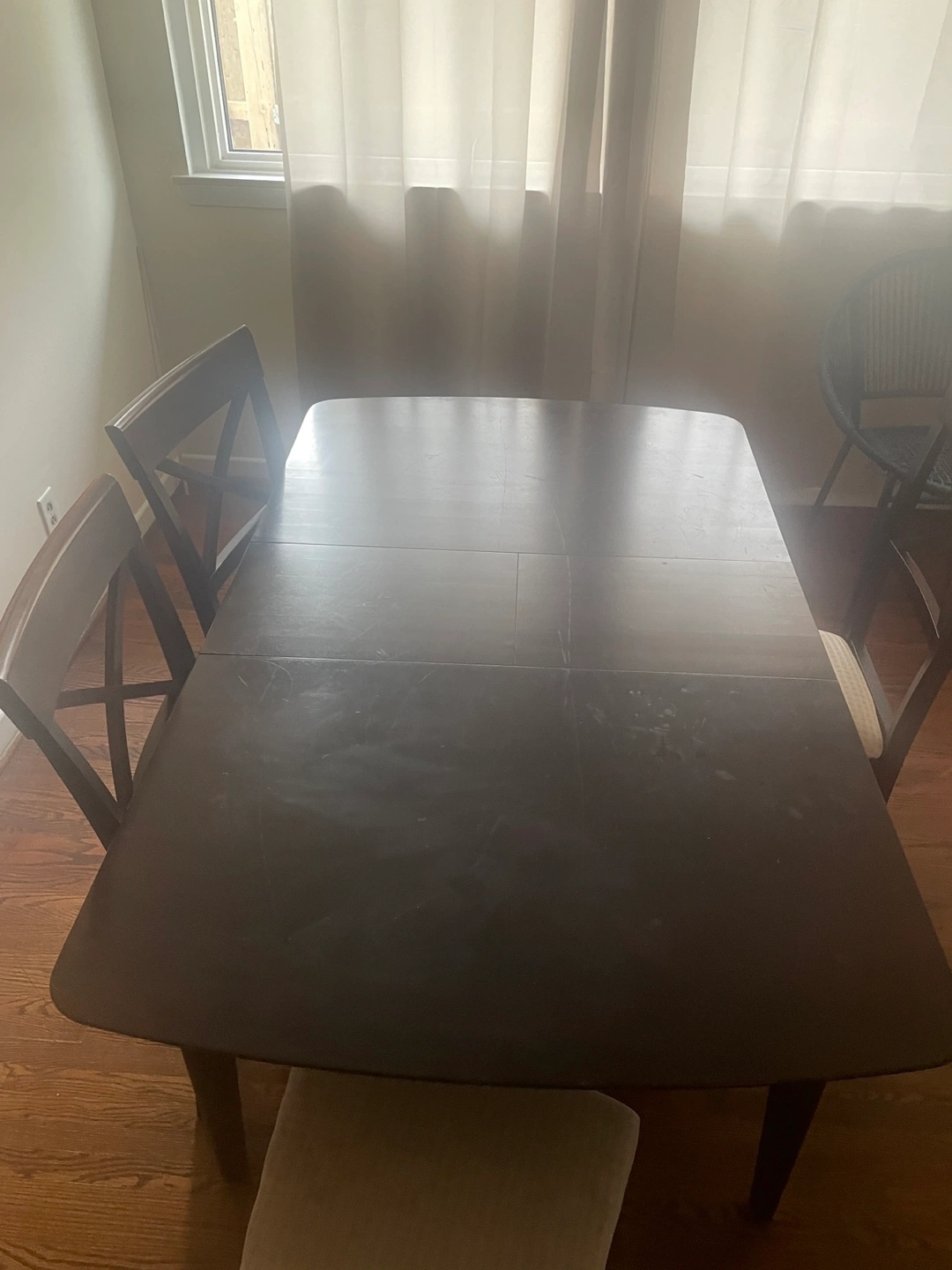 Bought at an estate sale a few months ago, selling because I’m moving out. The table has been used fairly and has some wear and tear. It has latches that can turn the table smaller and bigger.