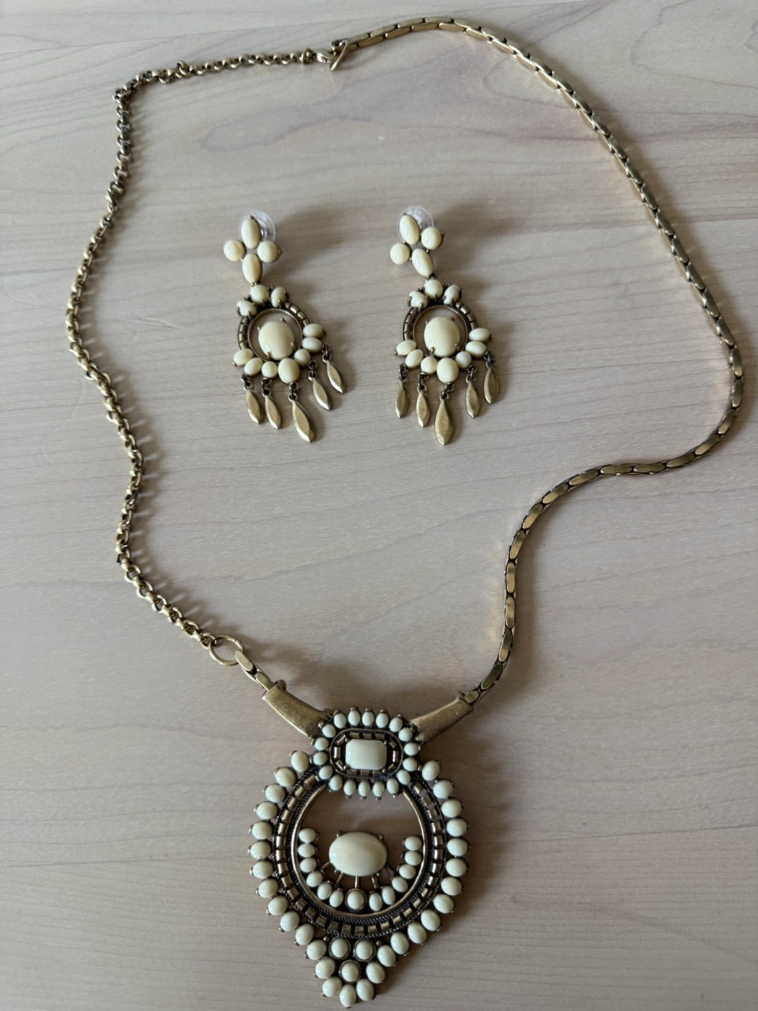 I am selling a lovely necklace and earring set. The set is gold-toned. Features white beads and circular pendants. The earrings have a chandelier shape. A perfect accessory to wear for a relaxing evening out.