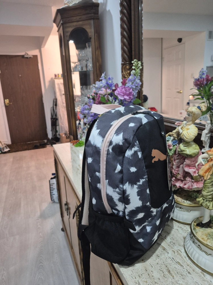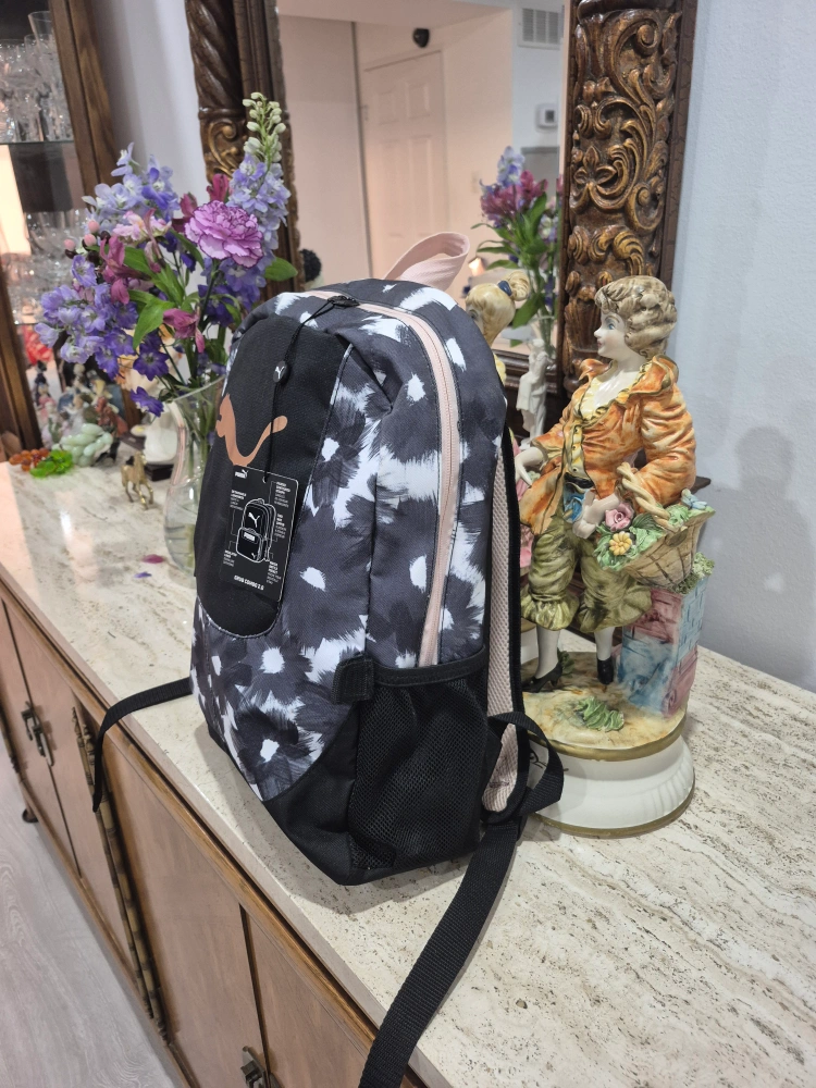 310Backpack featuring a unique pattern. A perfect companion for any travel. The backpack has a pocket on the side and padded straps.