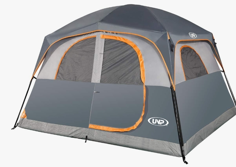 Grey tent with orange accents. Several windows with mesh covering. Perfect for camping and spending time in nature.