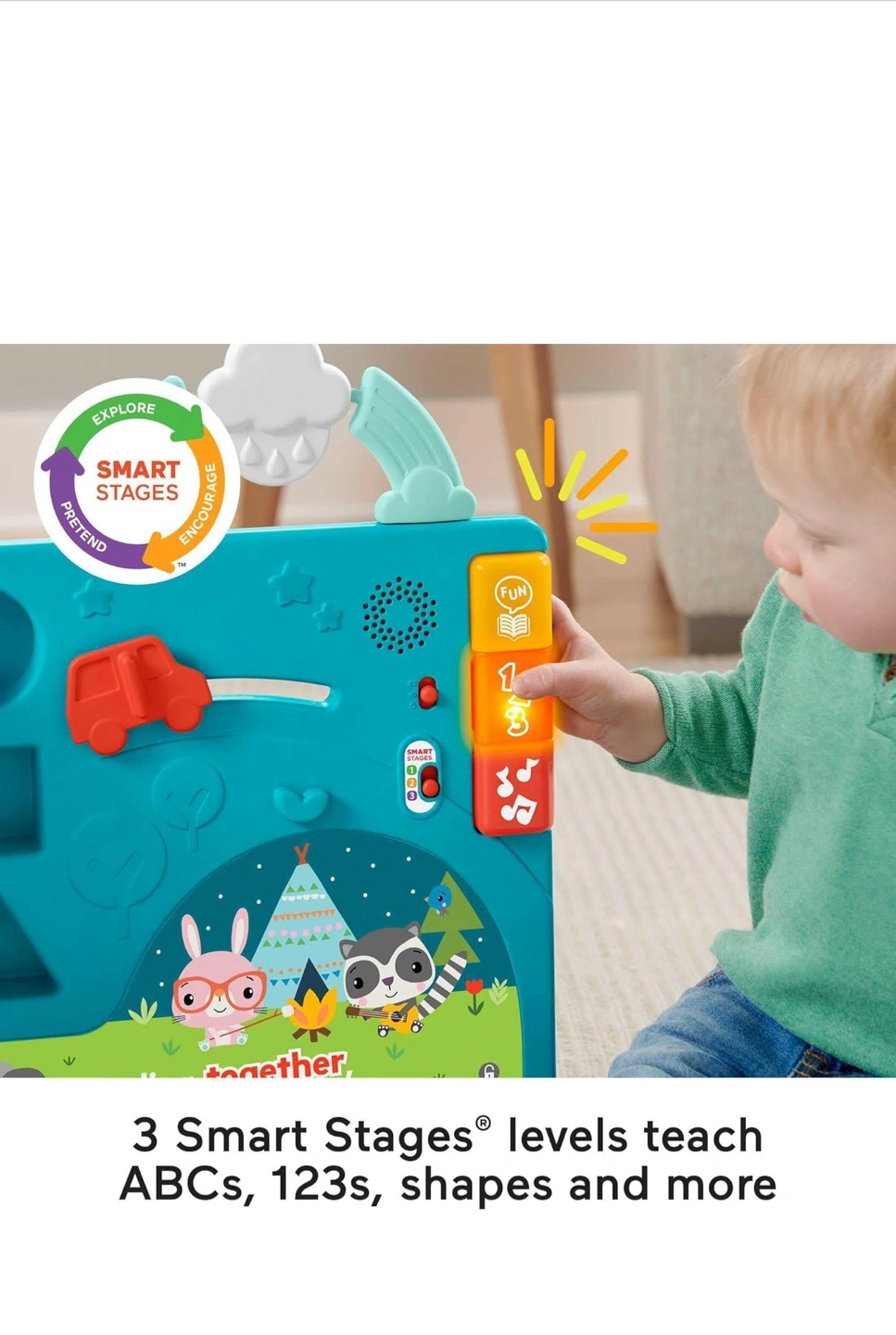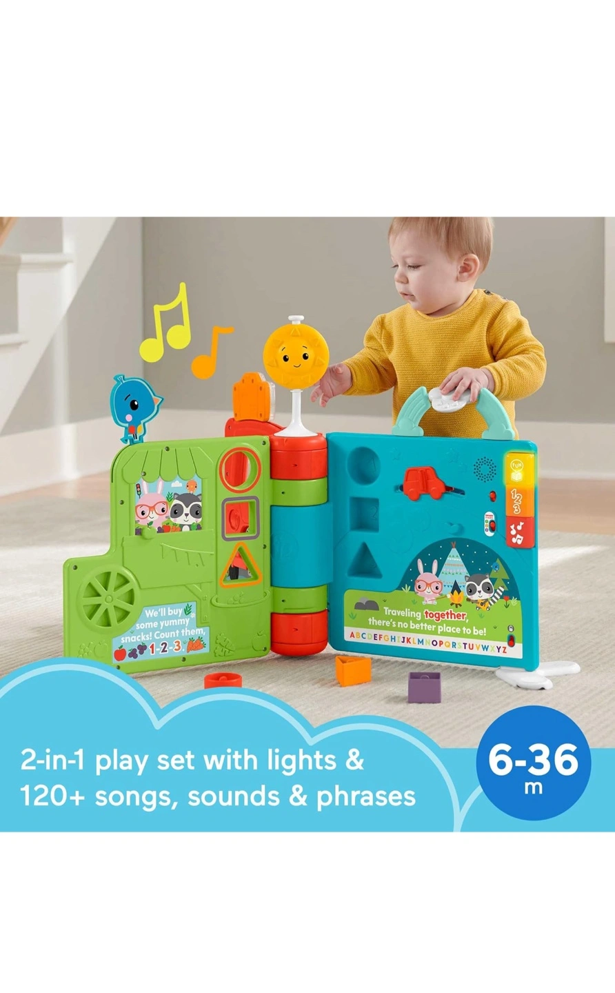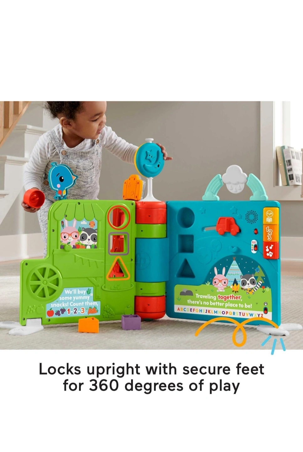 2-in-1 electronic learning toy that transforms from sit-at storybook to sturdy, upright activity center with 360 degrees of play