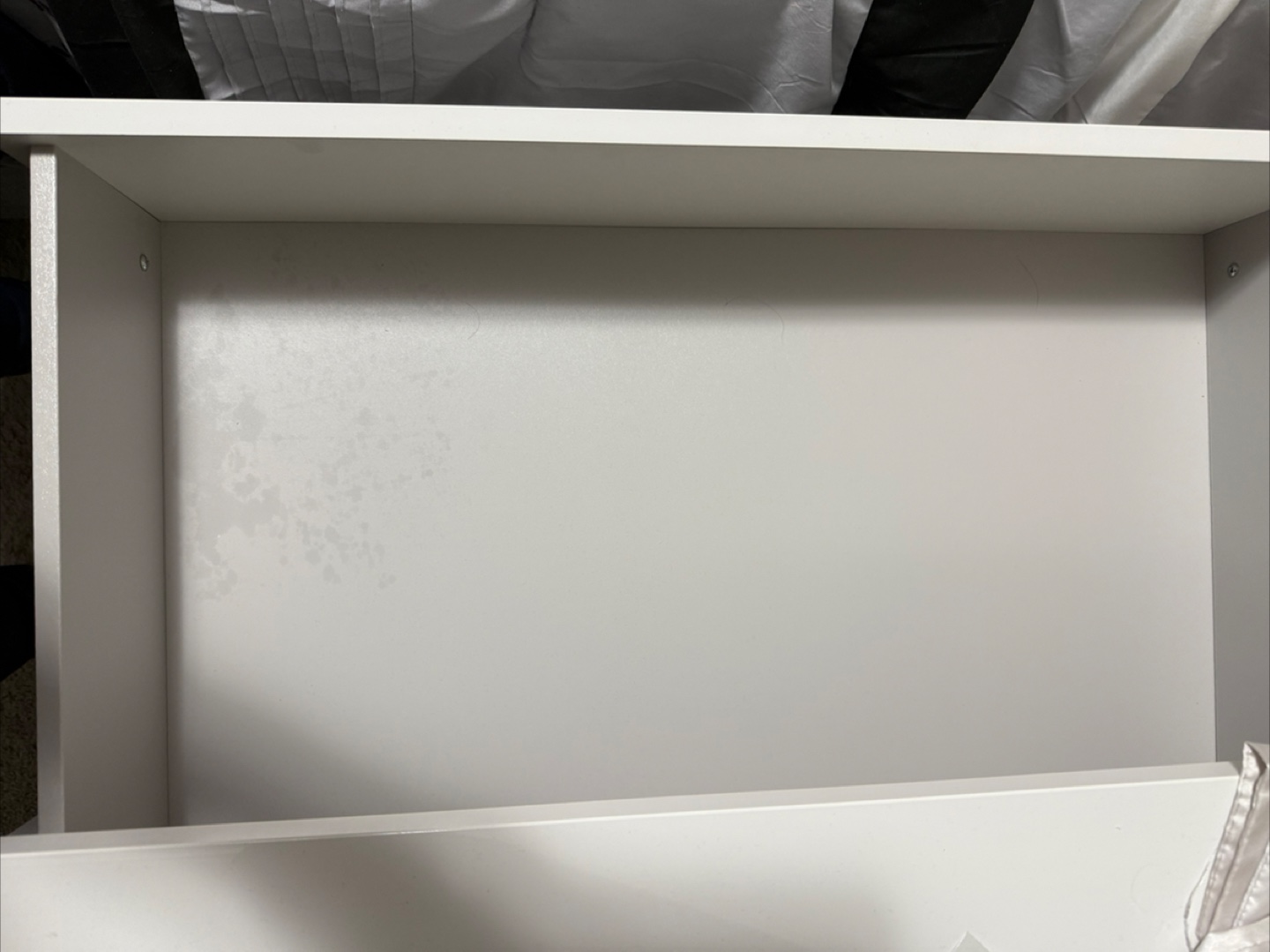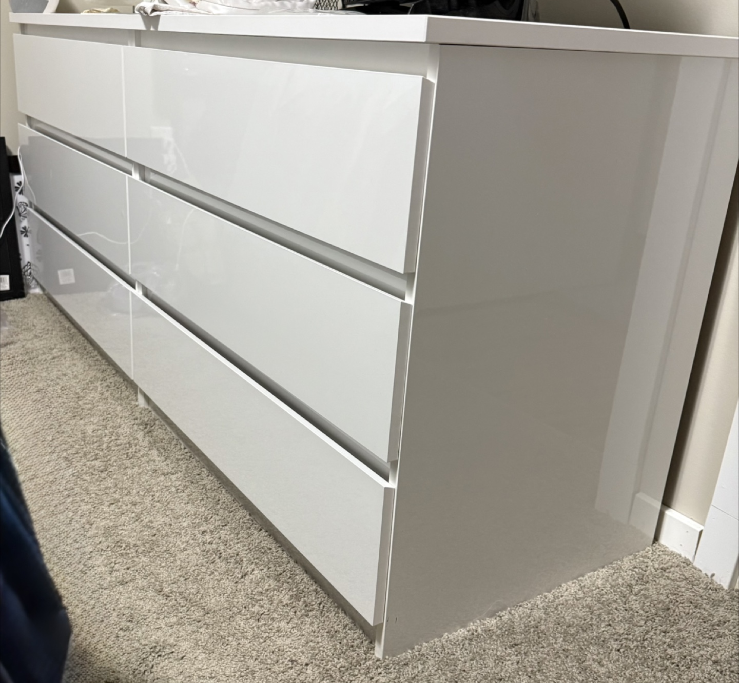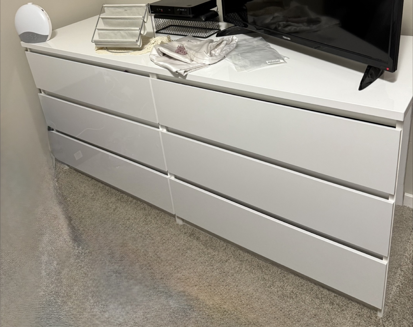 A sleek white dresser. Featuring six long drawers. Plenty of storage space. You can organize your belongings in peace with this lovely piece of furniture.