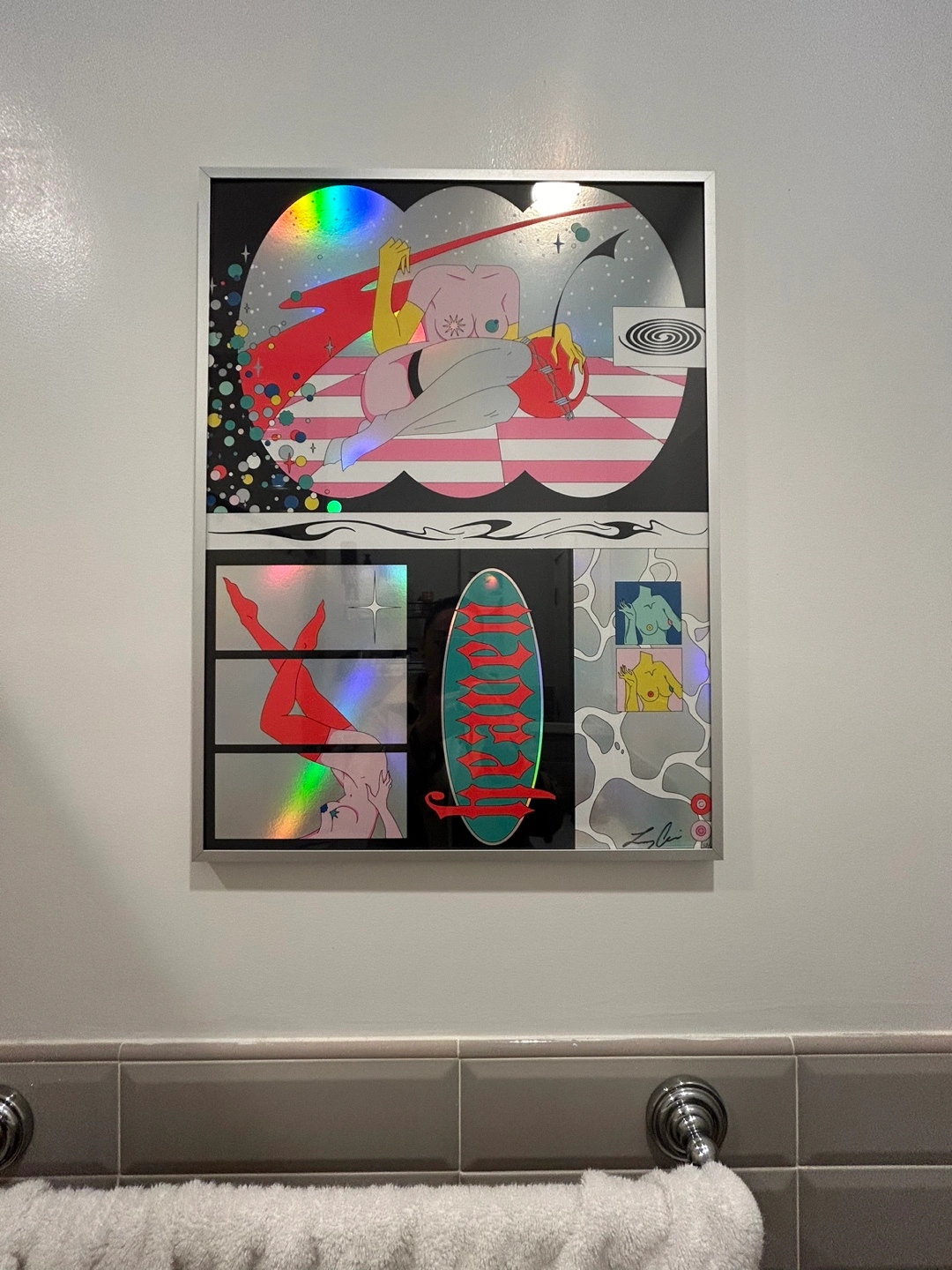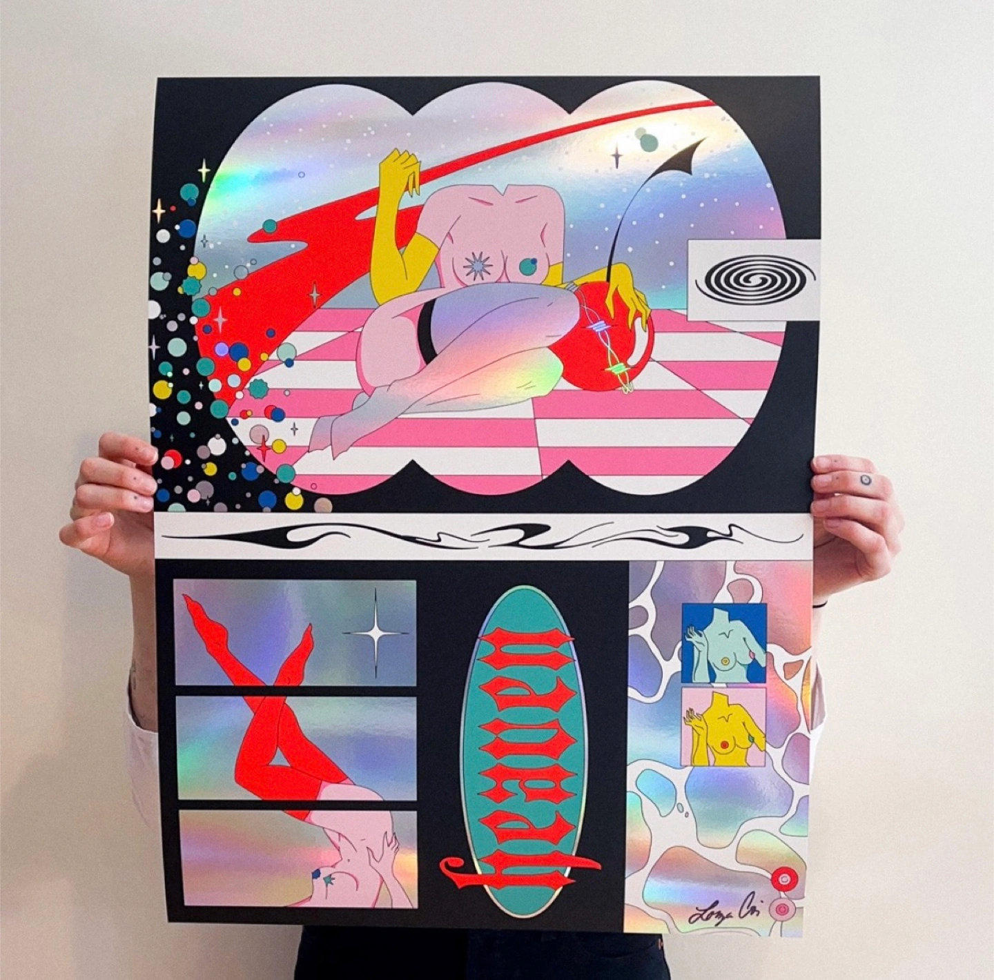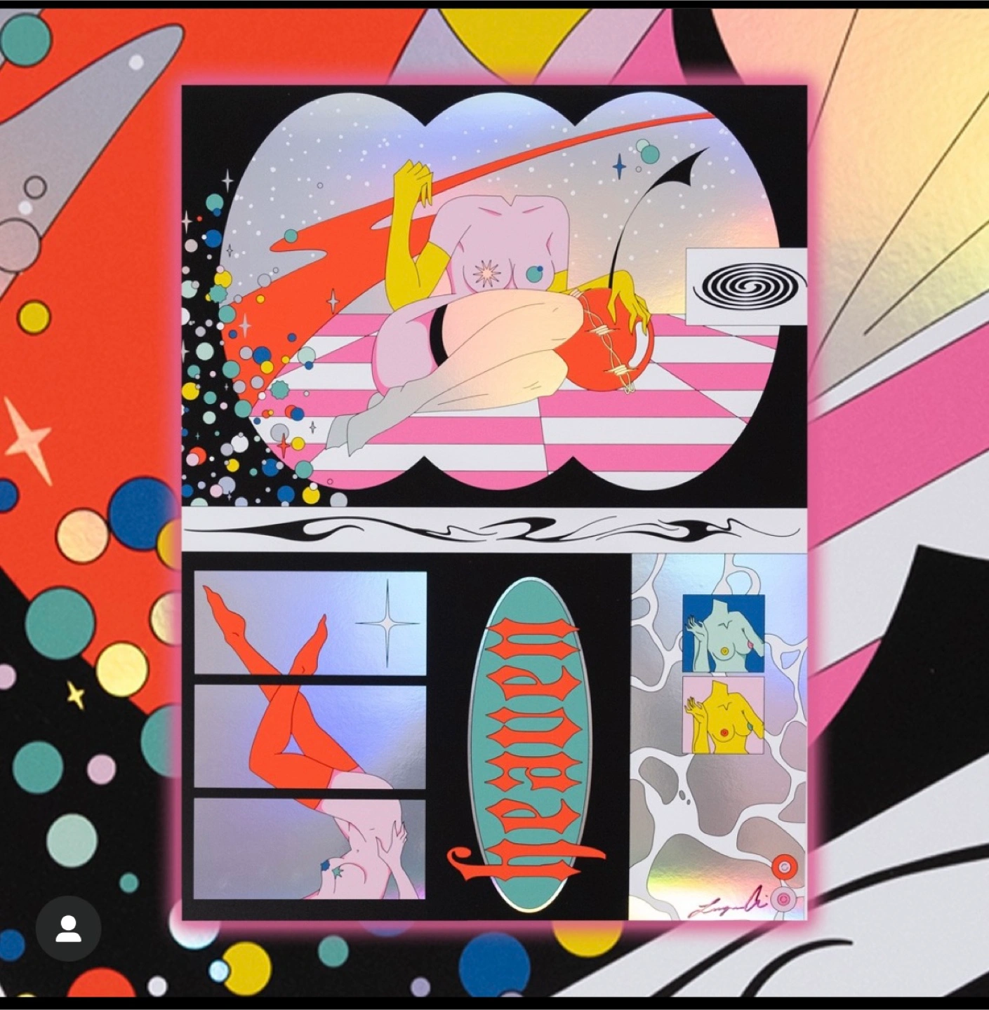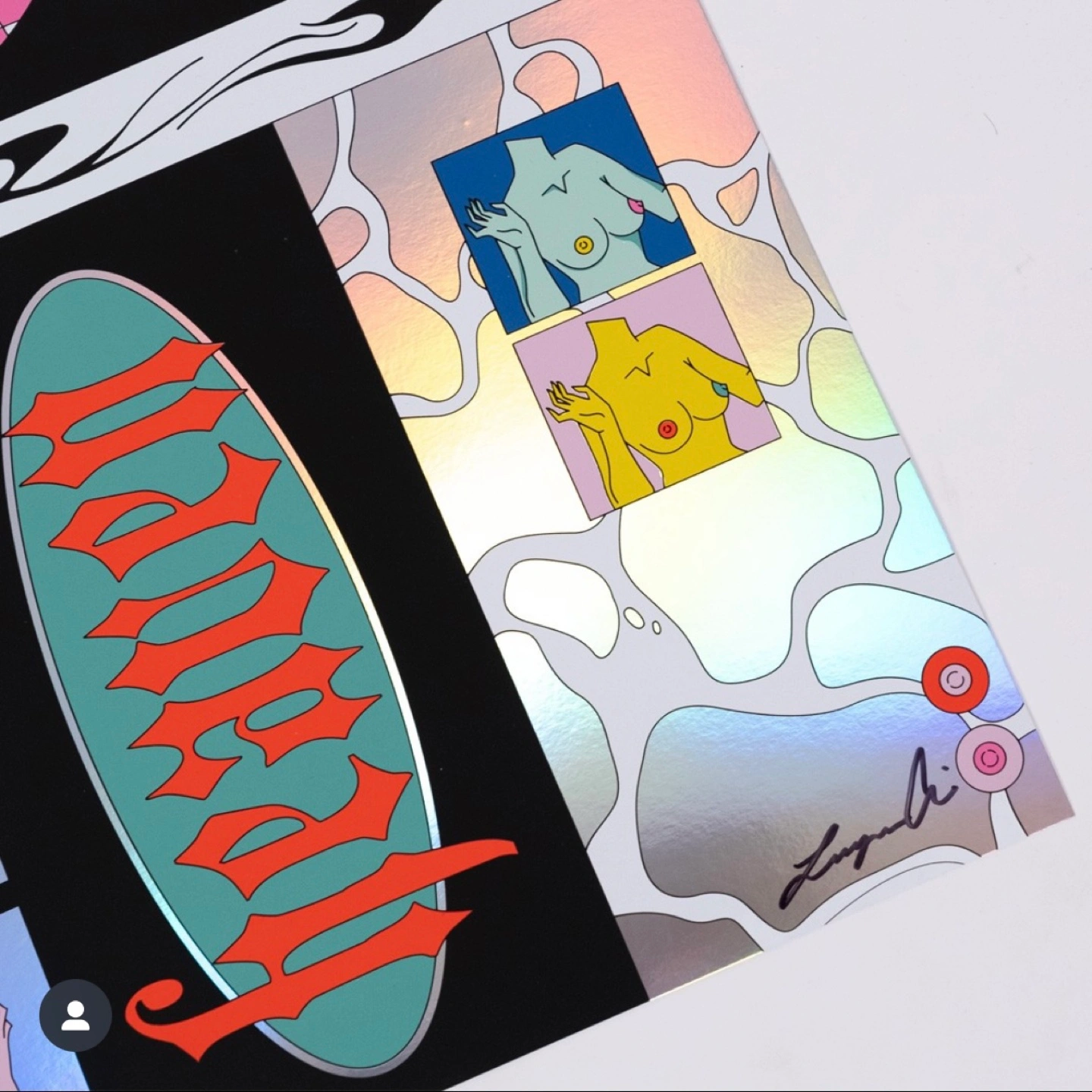 “To Make Her Glow” by L Centi. Framed original SPECIAL LIMITED EDITION for international women’s day. Features rainbow holographic design & bold colors.