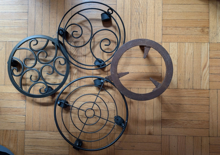 Here are four metal plant stands. They come in varying styles, including circular and scrolled designs. Three stands rest on wheels. Use these stands to move your plants with ease, while enjoying the peace of your home.