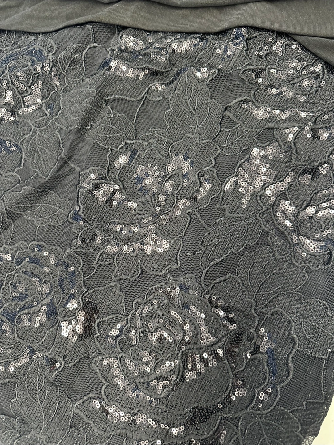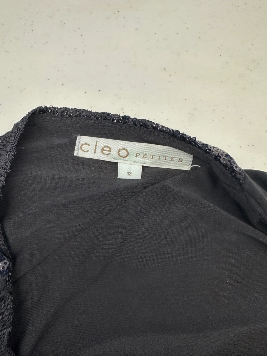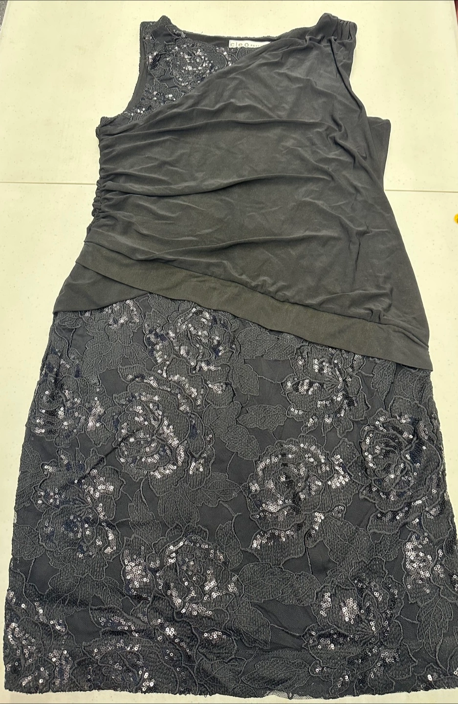 267Excellent used condition, only worn a couple of times. Black cocktail style dress in ladies 12 petites. Boatneck style with solid black material around middle of dress, with flattering pull to the side. Sequins are of a floral pattern. Short, length to hit around the knees. Fully lined. Perfect for your special occasions!! Smoke free/ pet free home.