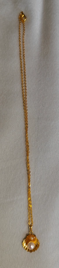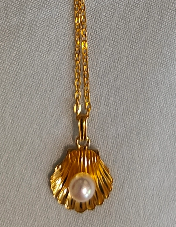 Beautiful gold necklace with a shell pendant and a pearl detail. The chain appears to be quite delicate. I believe this would be a lovely addition to your jewellery collection to make you feel at peace.