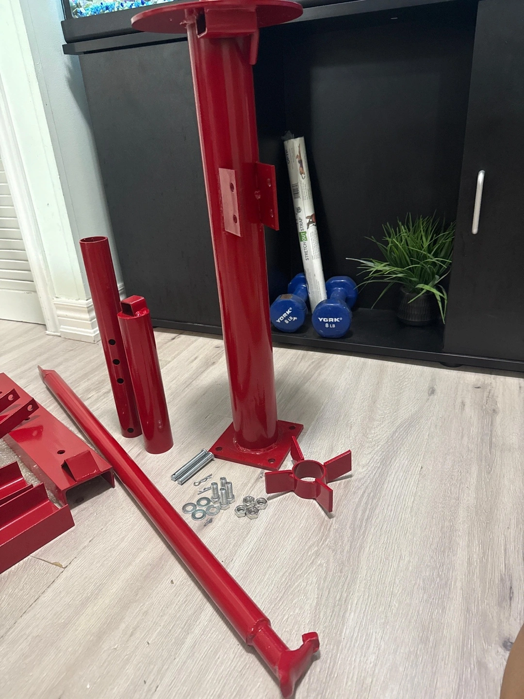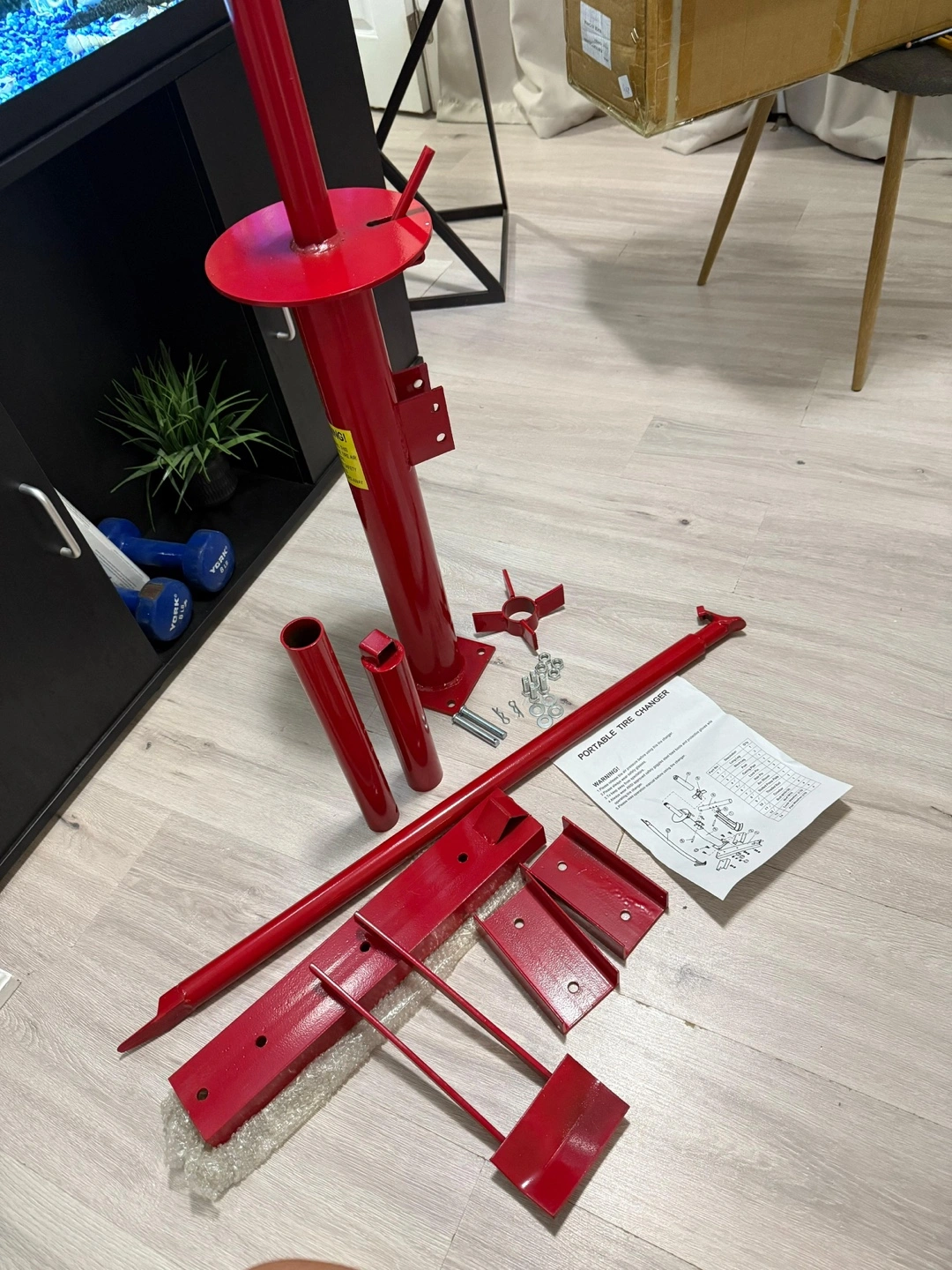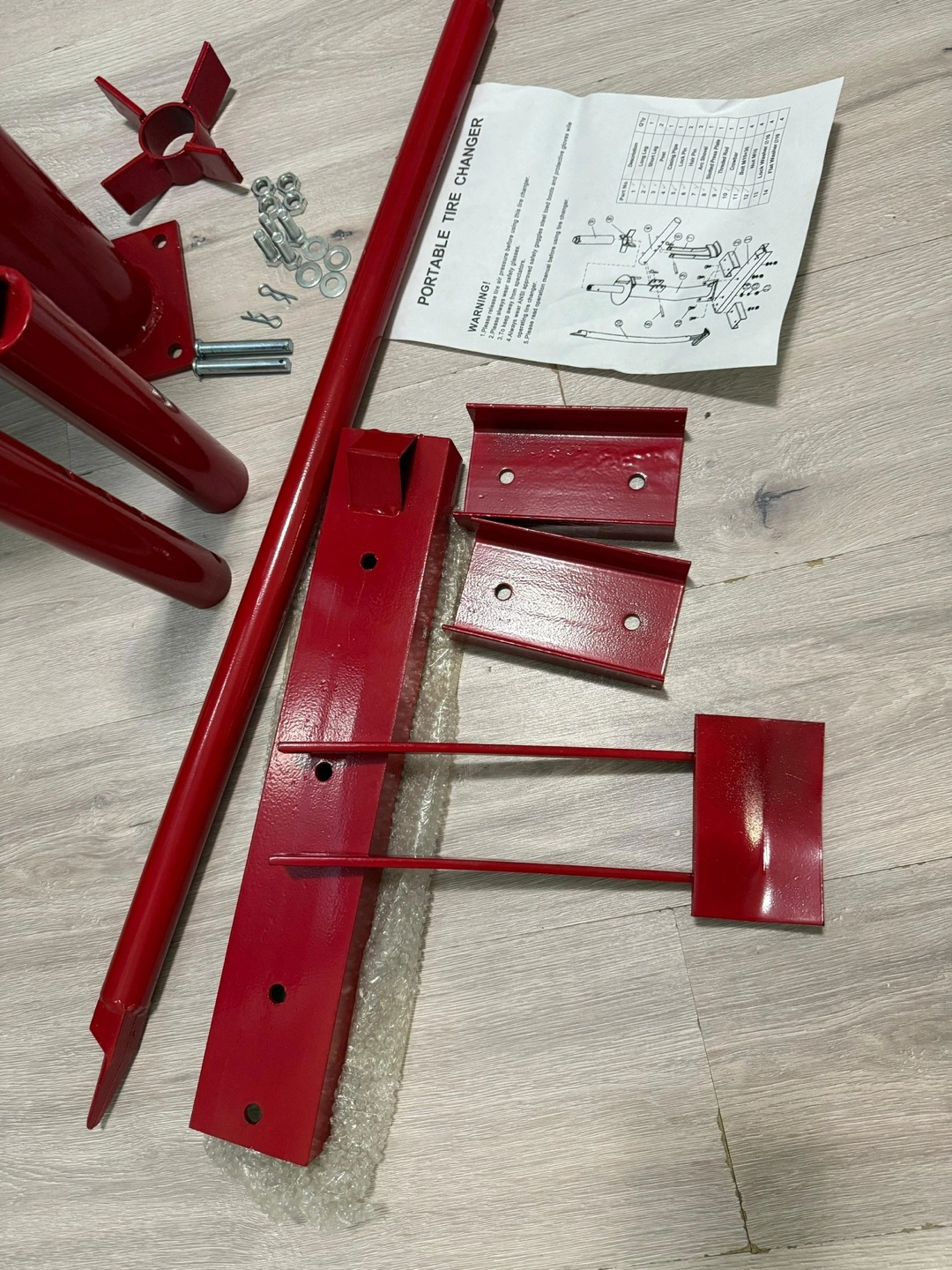 The pieces are painted red. Includes multiple parts, hardware, and an instruction sheet. This tire changer can bring convenience to your vehicle maintenance routines.