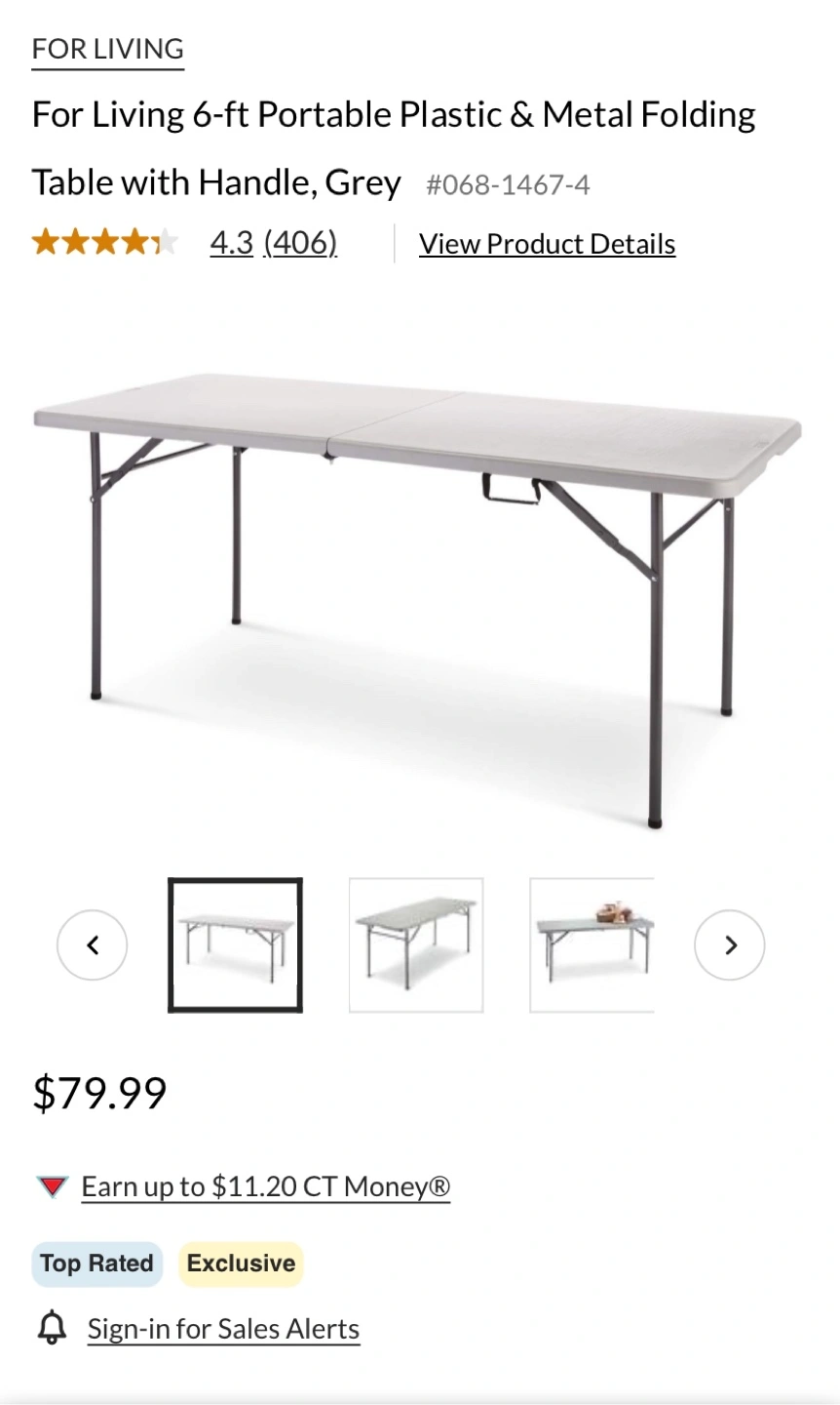 I am selling a 6 ft Canadian tire foldable table. It is a neutral colour and has a convenient handle, wheels at the bottom. This table is perfect for an indoor or outdoor activity. It’s brand new. Never used it. Retail price is $80.