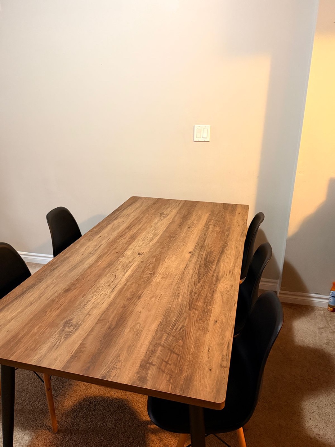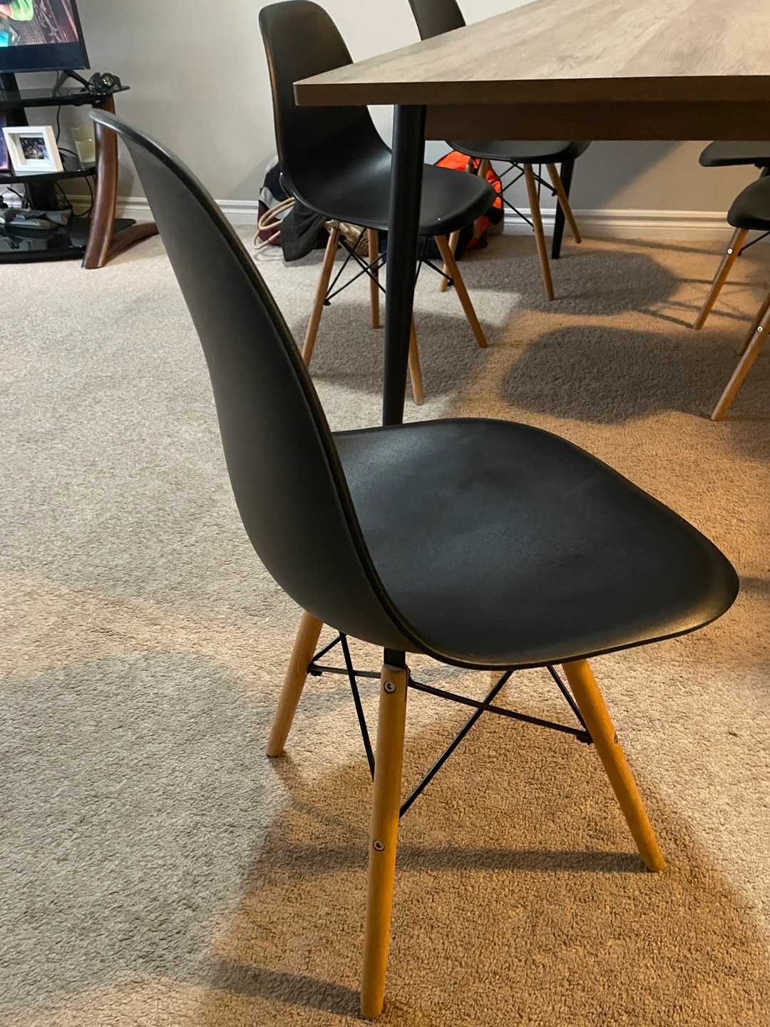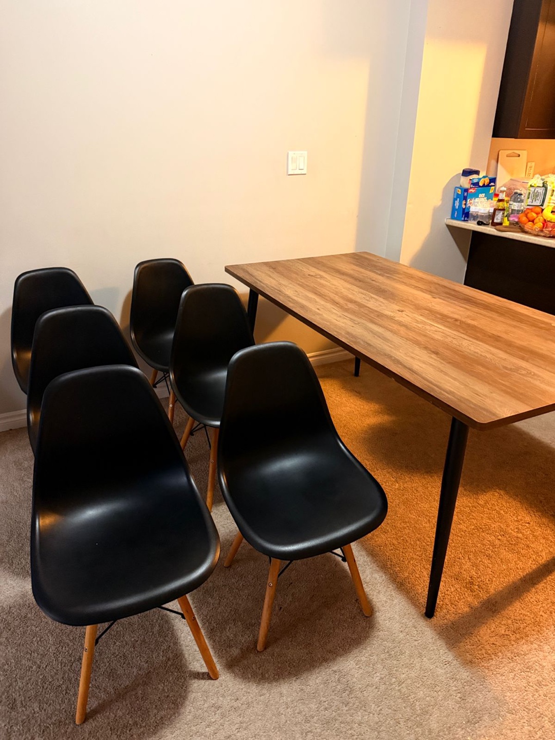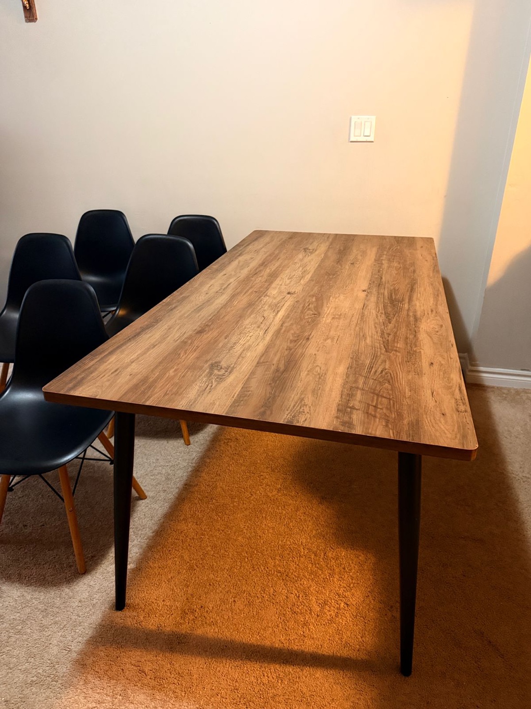 Included are six black chairs and a wooden table. The table features black legs and a light brown tabletop. These chairs will add a sense of peace to your dining area.