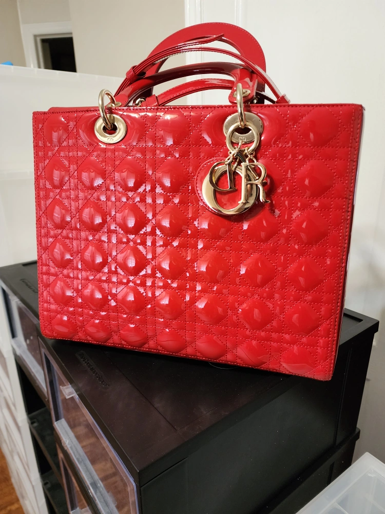 90The shiny, bright red handbag is elegant. It has a unique pattern and a few gold details. Consider carrying this bag to give yourself a moment of peace.