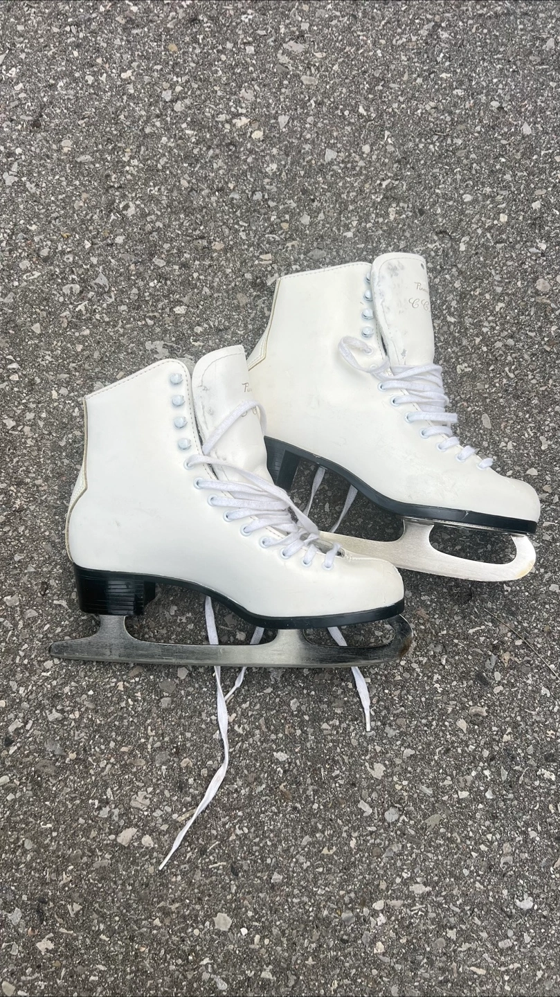 White figure skates with laces. Skates have black heels, and silver blades. A great way to relax and be in touch with your feelings. 9”2/3