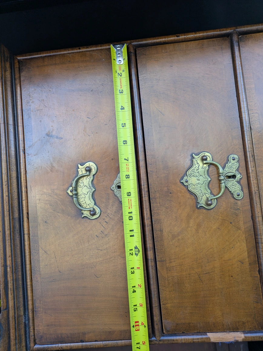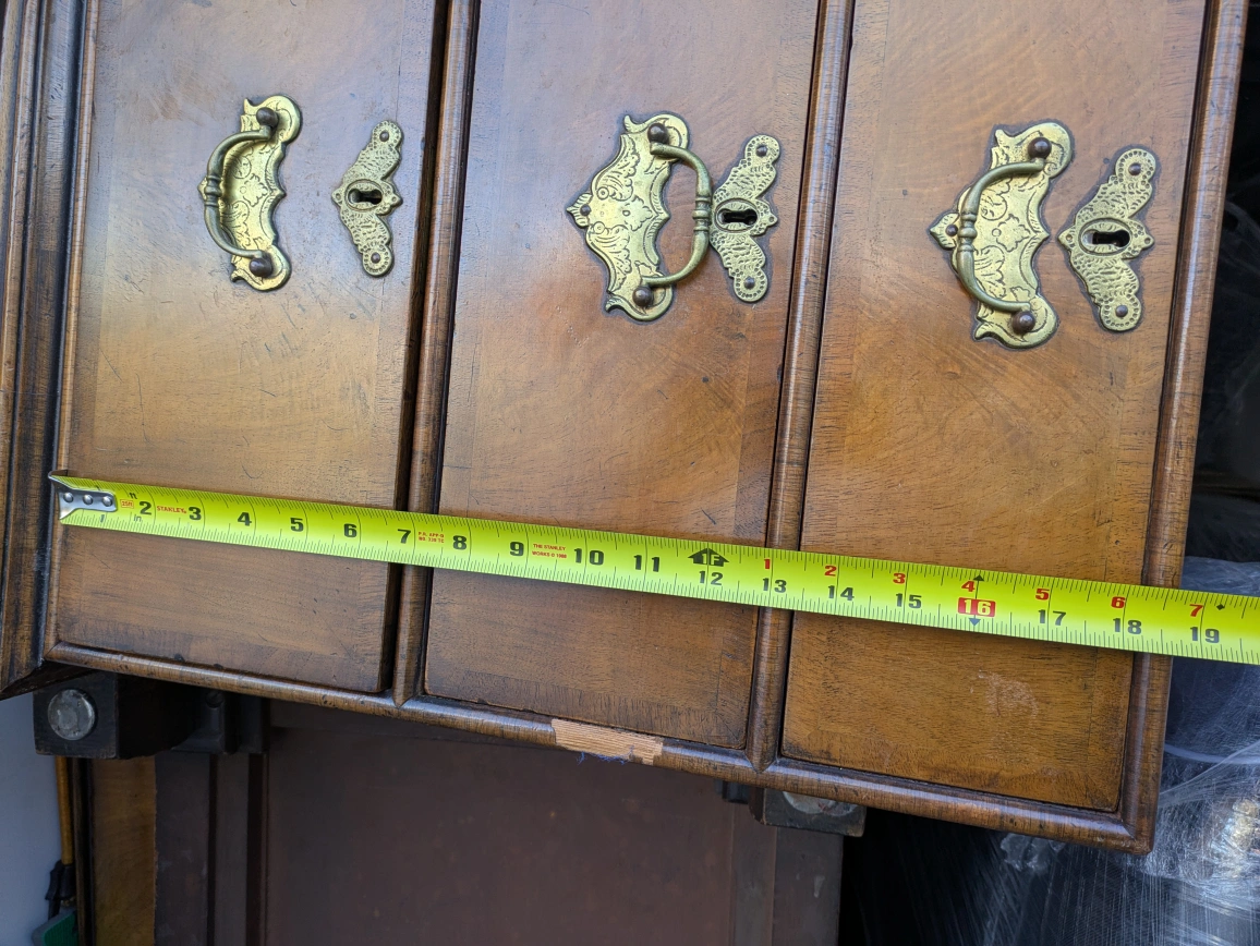 The desk has a large surface area, multiple drawers on either side with gold handles, and also made from wood. the cabinets are accessible from front and back. they do not hold files.