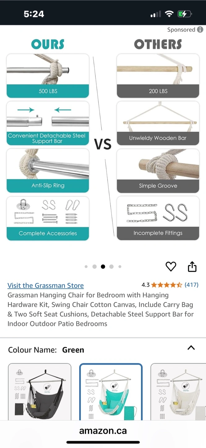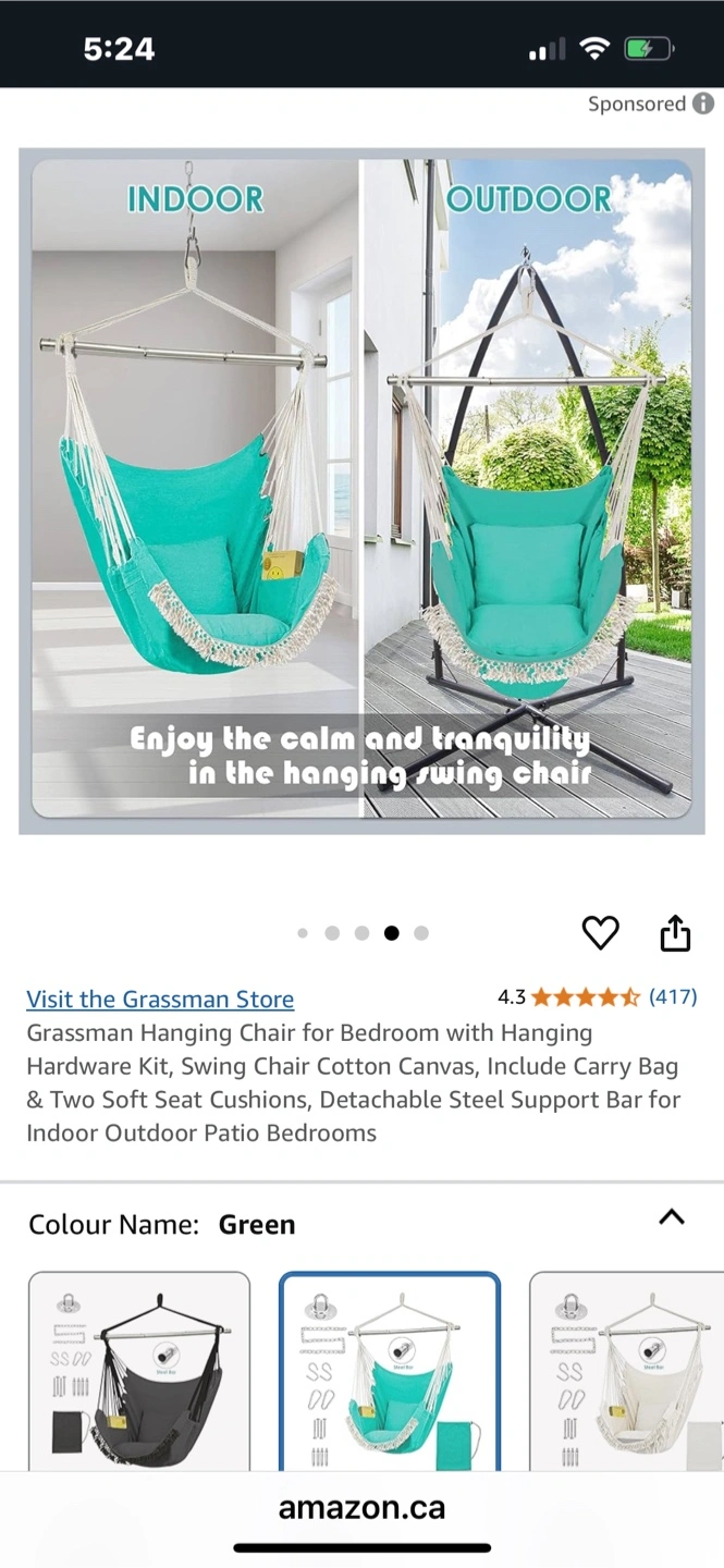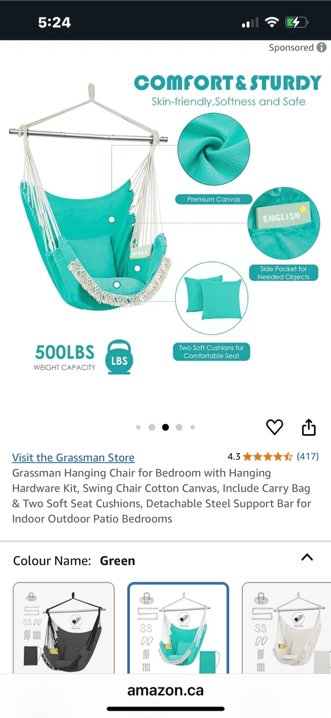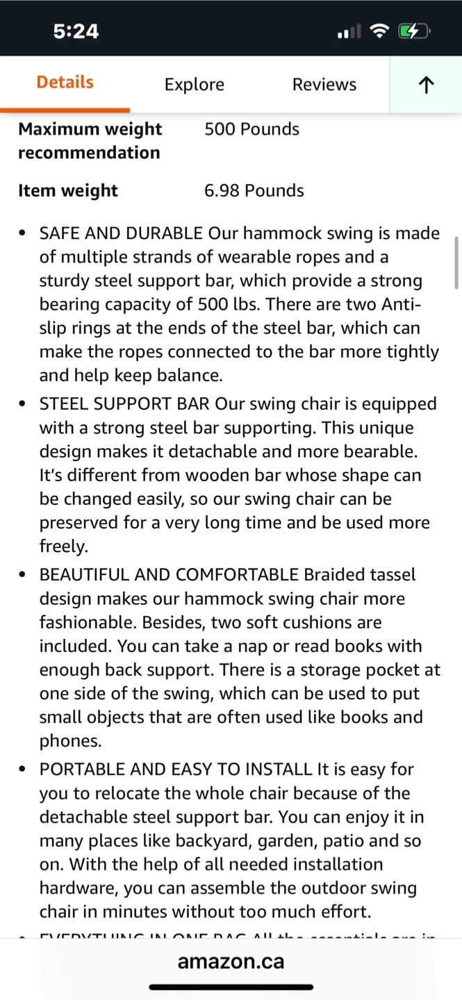 This hanging chair features a soft seat and rope supports. It also comes with 2 pillows and its own carrying bag. Use indoors, great for a kids room, or outdoors. Add fairy lights and it looks amazing