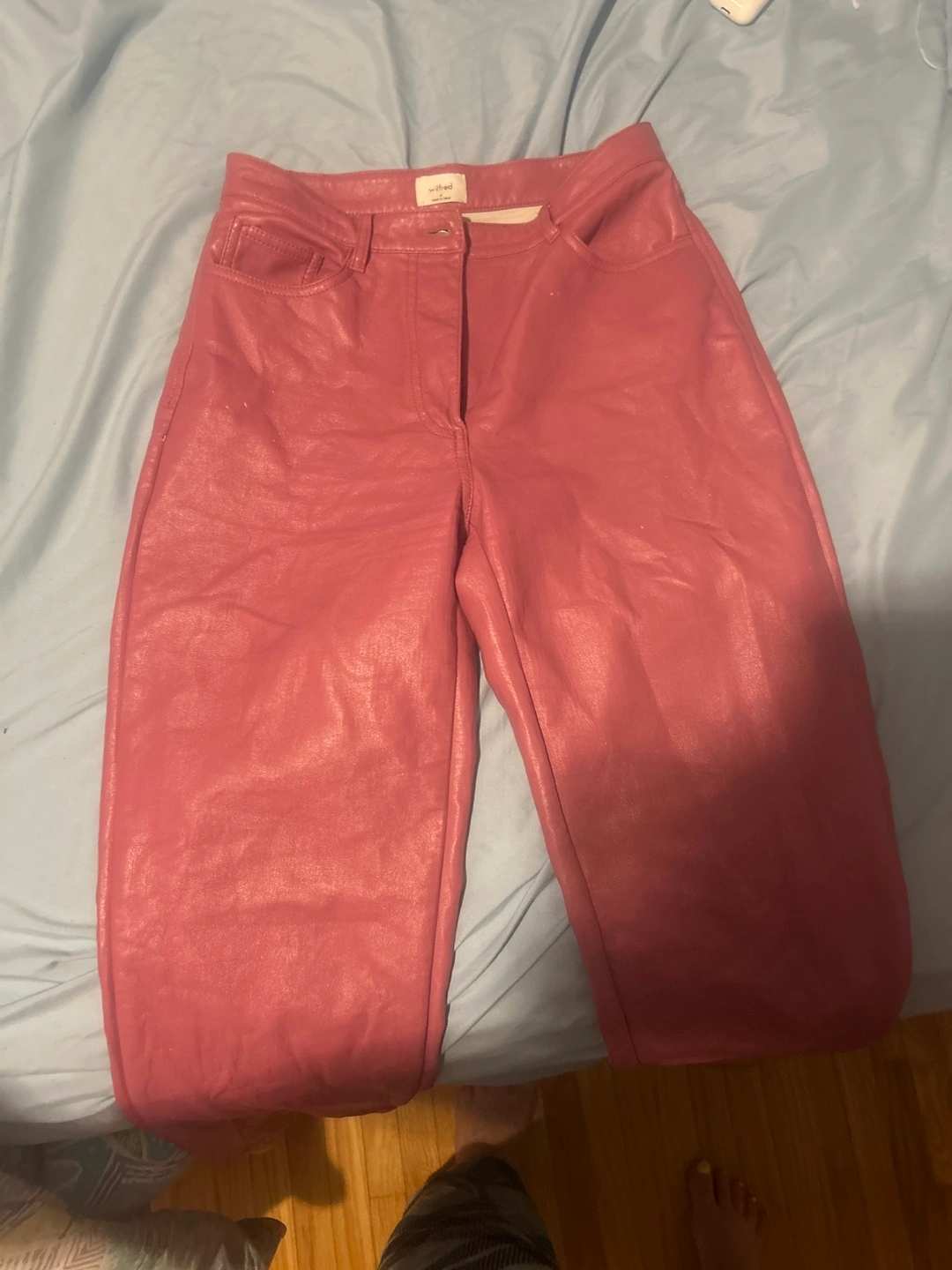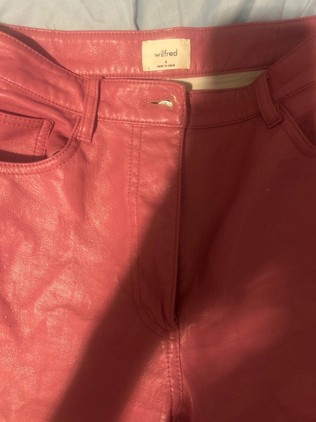 A pair of pink leather pants. Size 4 and in good condition. Some small chips in front