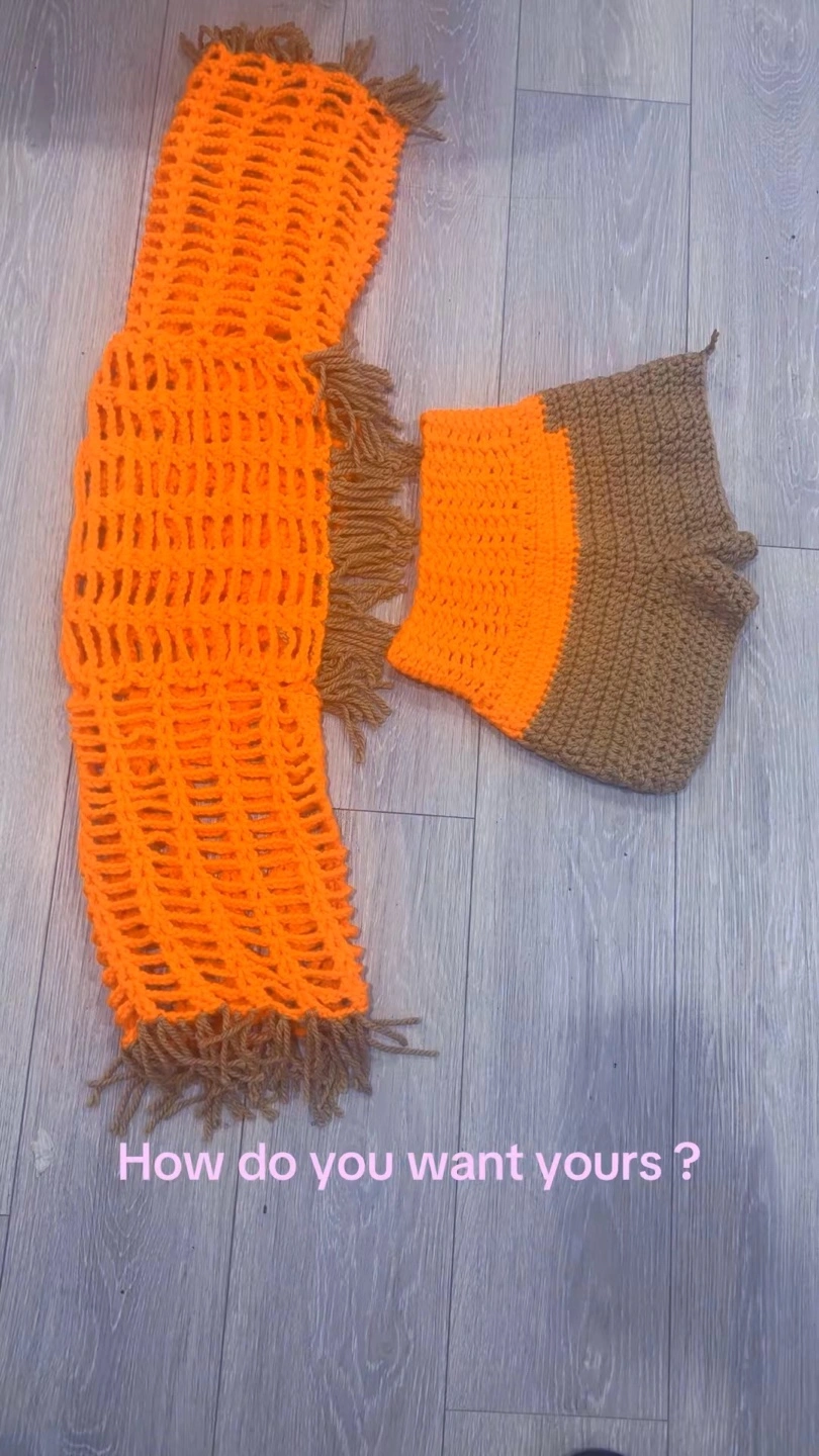 18A lovely crochet short and beautiful top, good for the summer. Features a short and top covering. The design is two-toned, orange and brown. This short set is perfect for a the summer