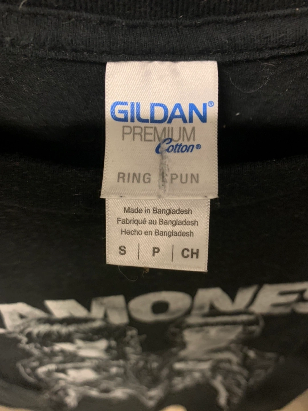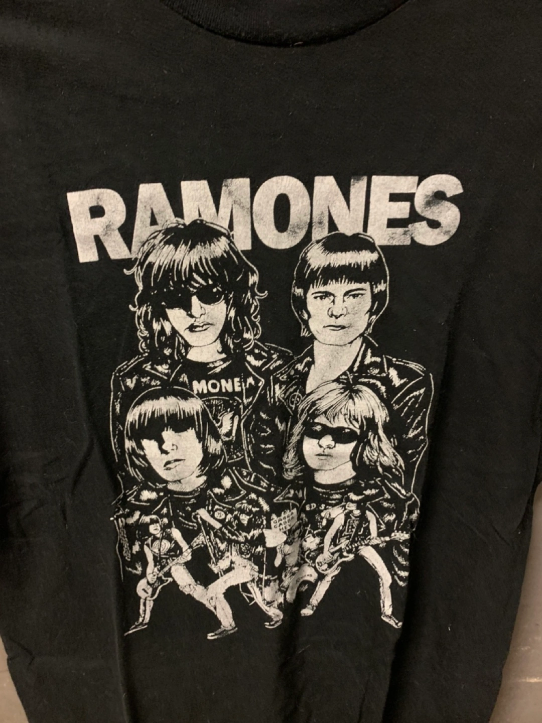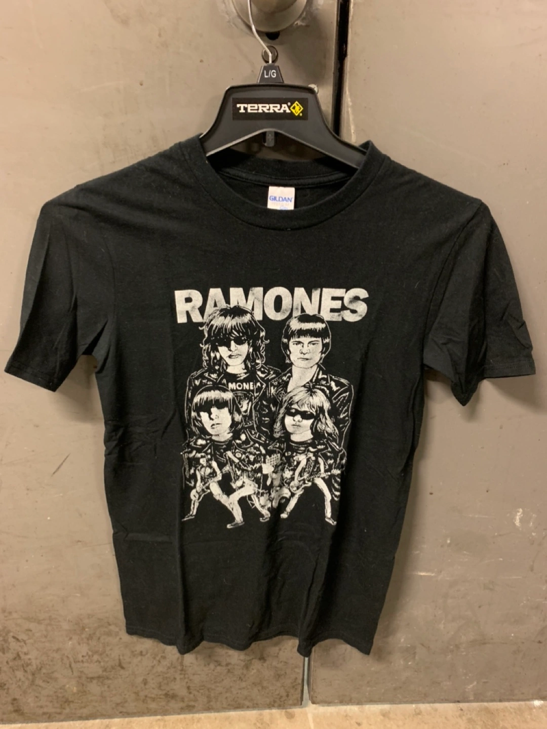 Black t-shirt, with the Ramones band graphic. The graphic is white. Imagine yourself wearing it, listening to your favourite music on a relaxing day off.