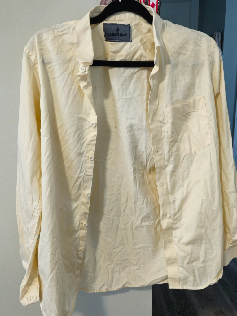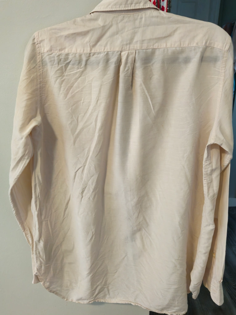 One shirt is light beige. The other is yellow and has a pocket. It has long sleeves. This shirt would be a great item to wear while lounging and relaxing.