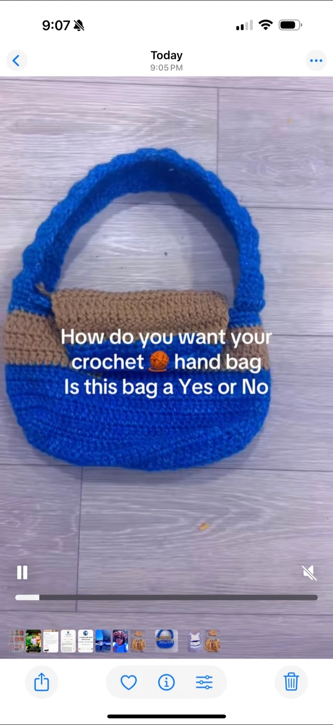 18A blue and tan crocheted bag. The handle is a wave like pattern. This would be a fantastic piece to have to keep your essentials with you.