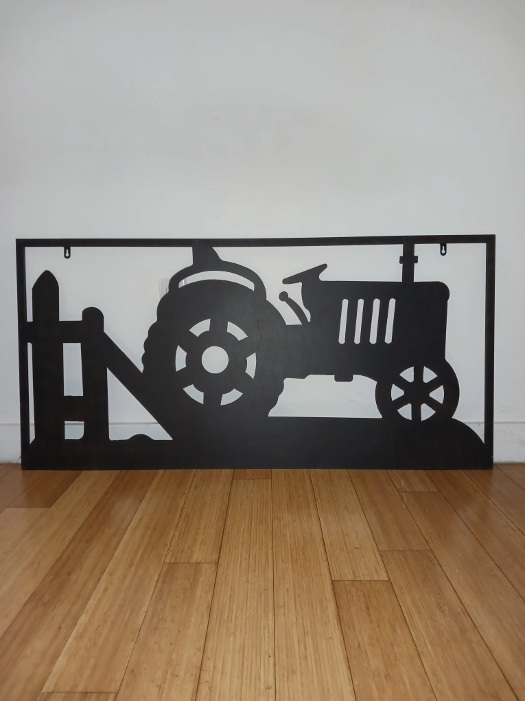 Add a touch of rural charm to your decor with this farm-themed metal wall art panel. Showcasing a striking silhouette of a classic tractor beside a wooden fence, this piece celebrates the hardworking spirit of country life and agriculture.