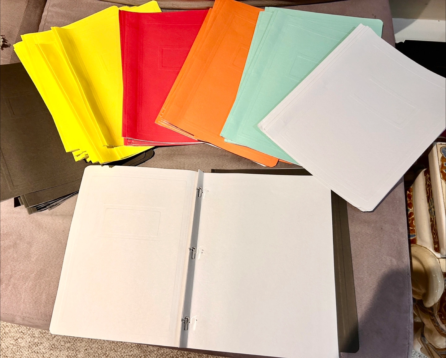 New colourful report covers with 3 ring binding. Many bright colours available. First come first served for colours. 40 folders for $10. Perfect for reports or for filing papers away. I also have report covers with two pockets.