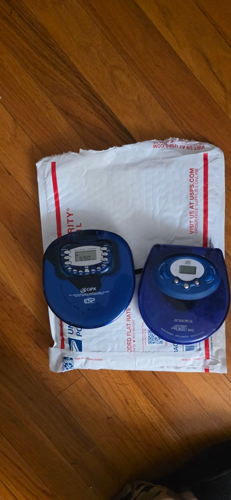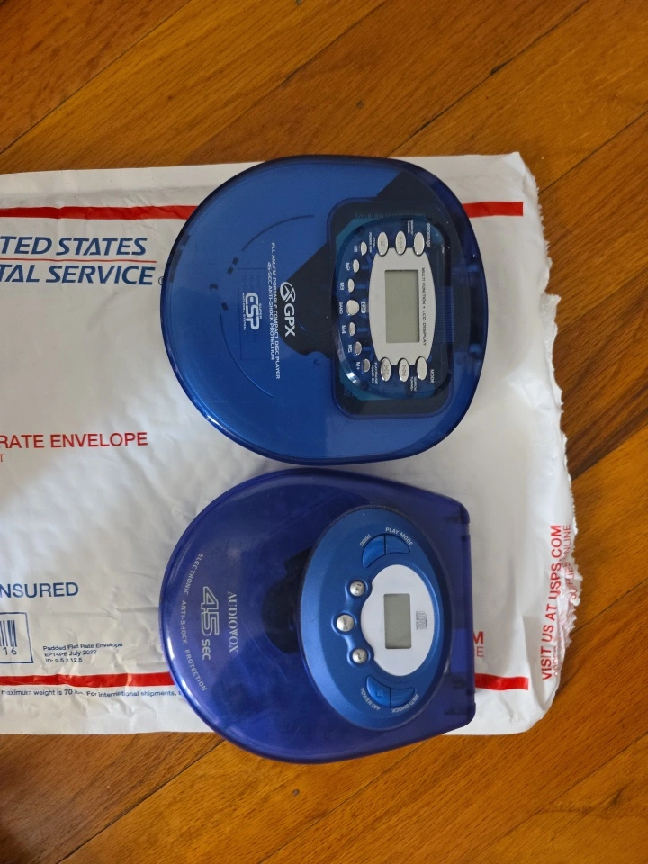 23used Two blue portable CD players. One with a digital display showing Both CD players have buttons for control. A great way to enjoy your favorite music peacefully.