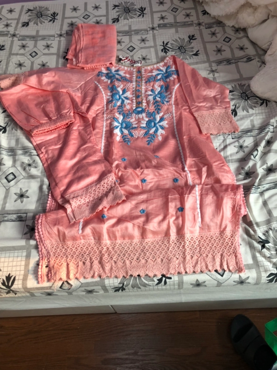 A lovely peach pink outfit. Includes a tunic and scarf. Delicate blue floral embroidery. A beautiful piece that brings a sense of peace. For Eid