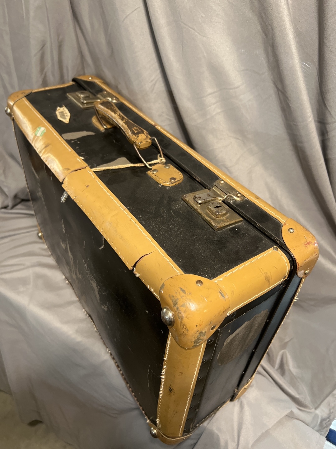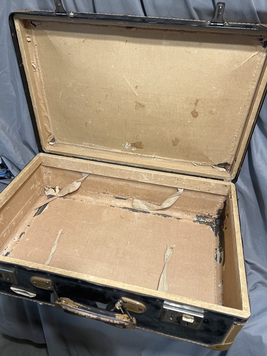 Great deco or Prop peice. The vintage suitcase has a black exterior. Details in light brown. Has metal clasps and a handle. A great place to store sentimental items.
