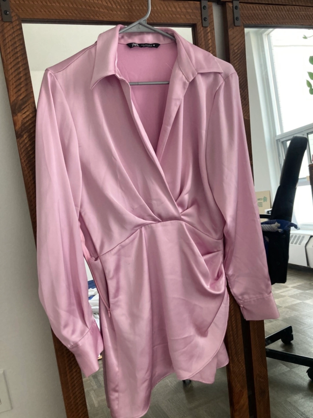 A lovely pink dress in a silky material. The dress features long sleeves with cuffs and a collared neckline. It has a wrapped design around the bust, with some gathering at the waist. This dress would be lovely for a walk in the park, giving you a tranquil feeling.