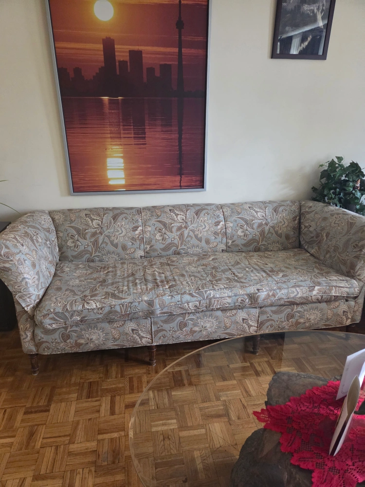 Couch with floral pattern design, made of fabric. Wooden legs are present. Place this couch in your living room for a cozy feel.