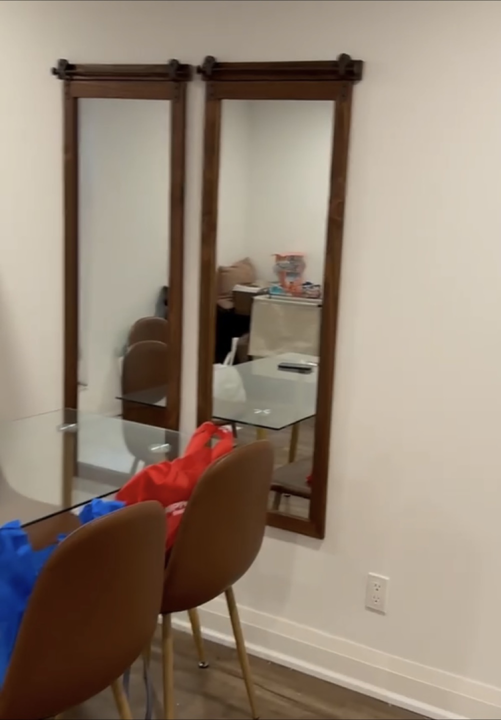Mirrors with a wooden frame. $60 each, $120 total pair. The mirror hangs from a metal bar and brackets. These mirrors would be perfect to reflect natural light into your home.