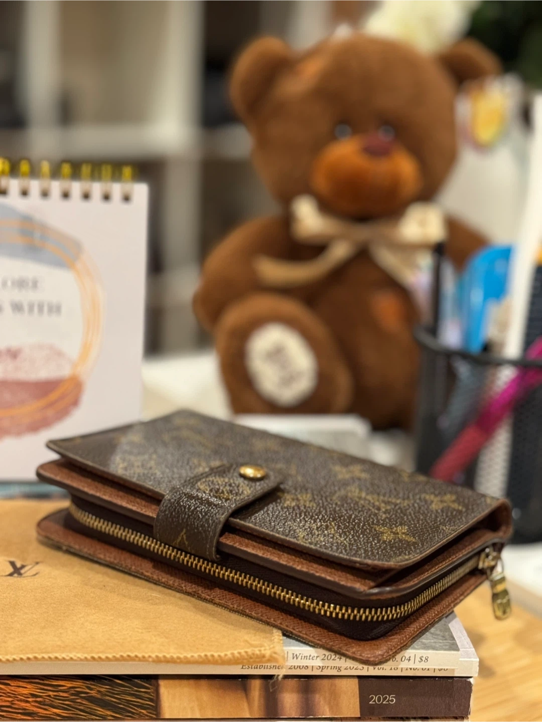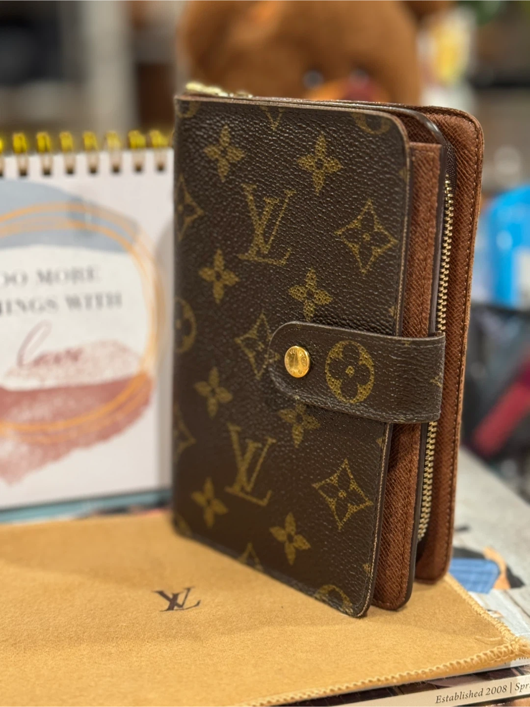 Classic Louis Vuitton monogram wallet. It's made from coated canvas with leather trim. Includes a snap closure and a zippered compartment. Perfect for keeping your essentials organized! Bigger size