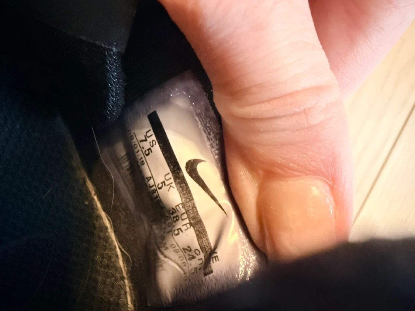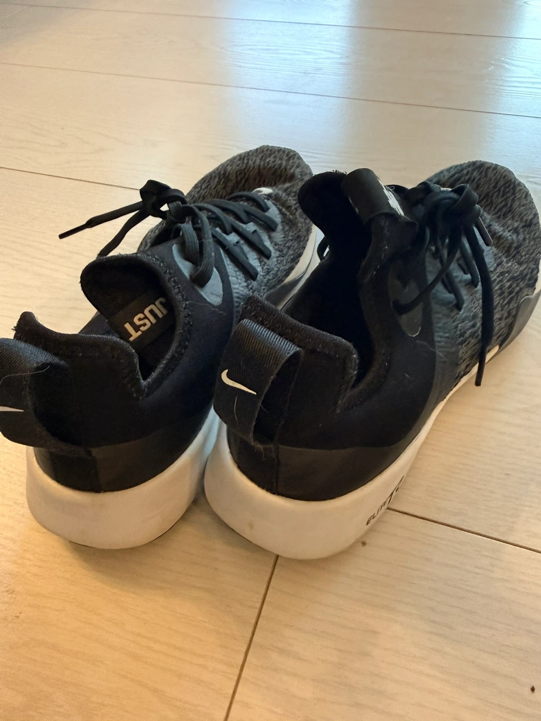 These Nike athletic shoes are black and grey. They're a women's US size 7.5. These would be great for training or running!