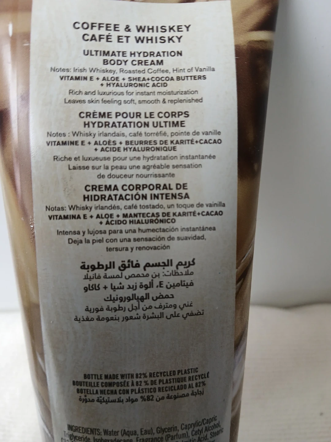 Bath & Body Works Coffee & Whiskey Ultimate Hydration Body Cream (226 g) and 3-in-1 Hair, Face & Body Wash (295 ml). The body cream offers 24-hour moisture. The wash is a gentle, non-drying formula. Both are designed for a rich and luxurious feel.