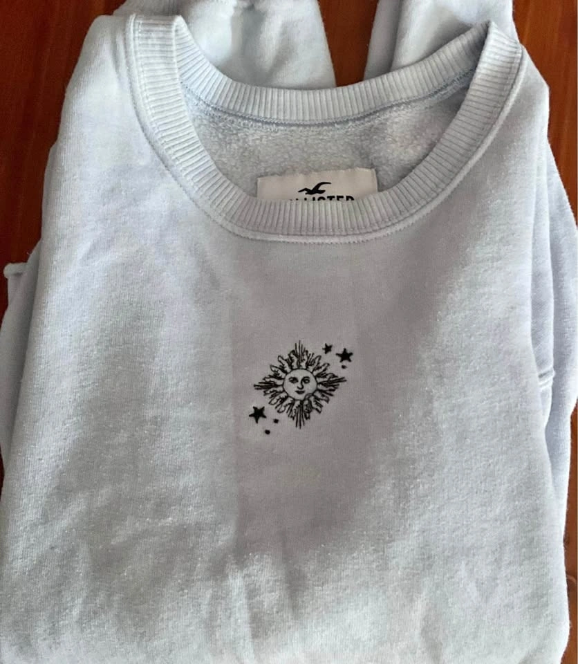 Comfy Hollister crewneck. Light blue color with sun and stars embroidery on front. Size small. I’m located in Seaforth Ontario.