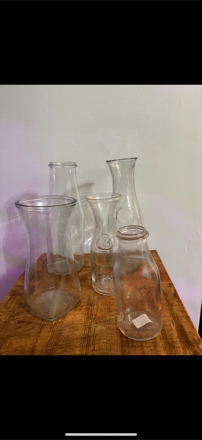 This is a set of five clear glass pitchers. They come in various shapes and sizes, made of durable glass.