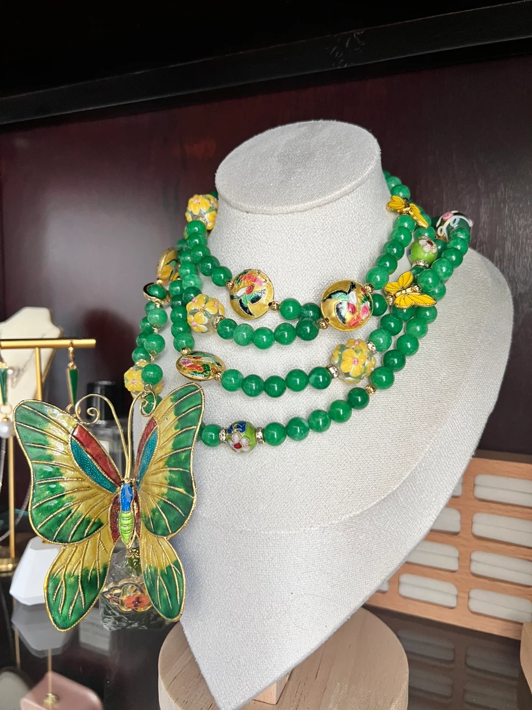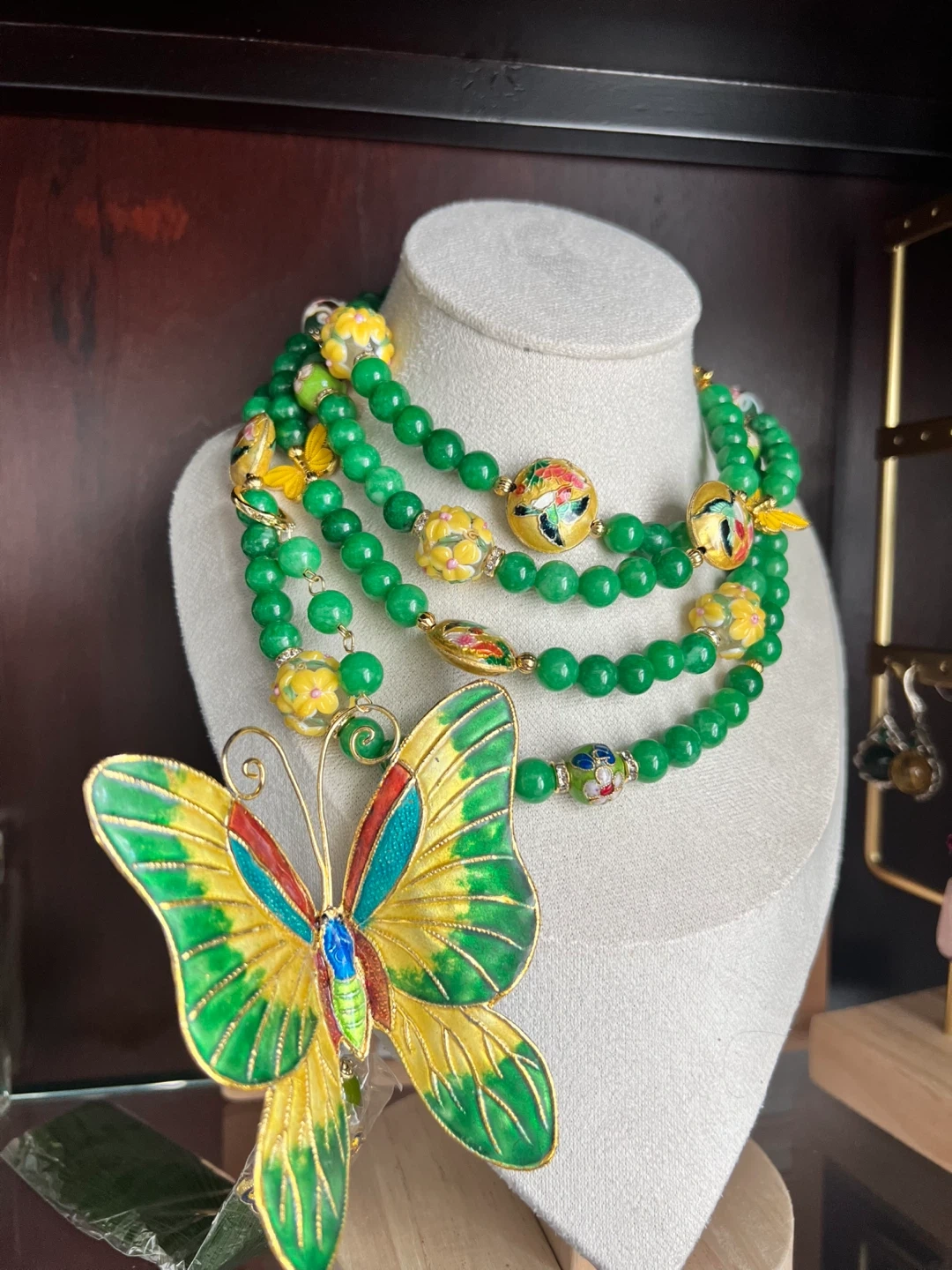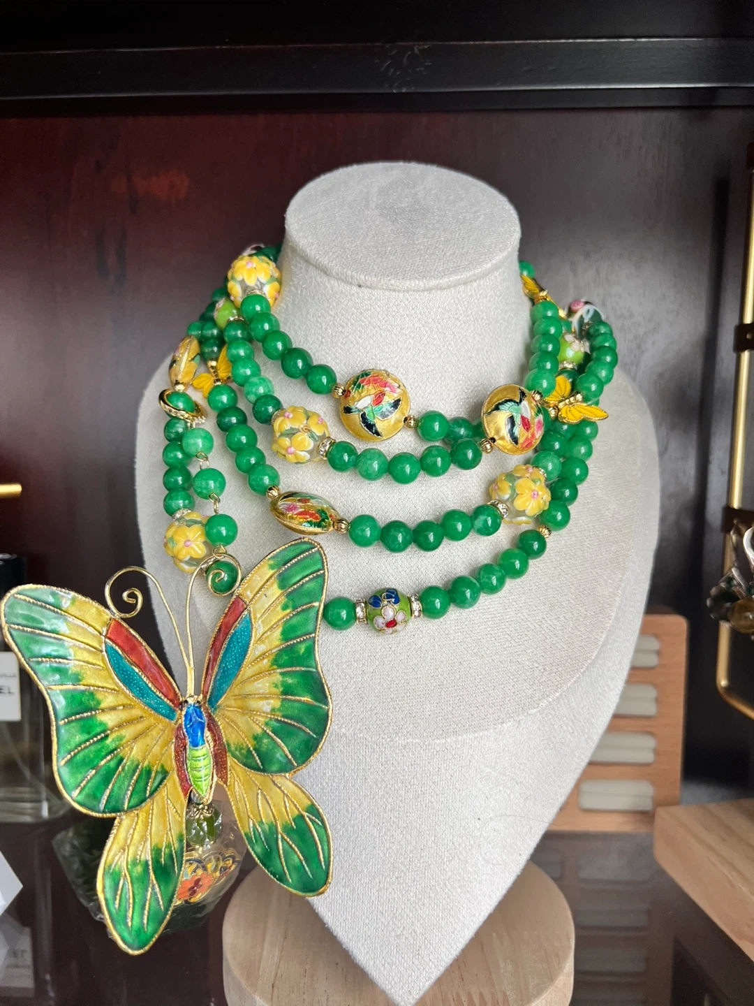 This is a multi-strand green beaded necklace featuring decorative yellow and floral accent beads. It's adorned with a large, colourful enamel butterfly charm. A lovely statement piece for any jewellery collection!